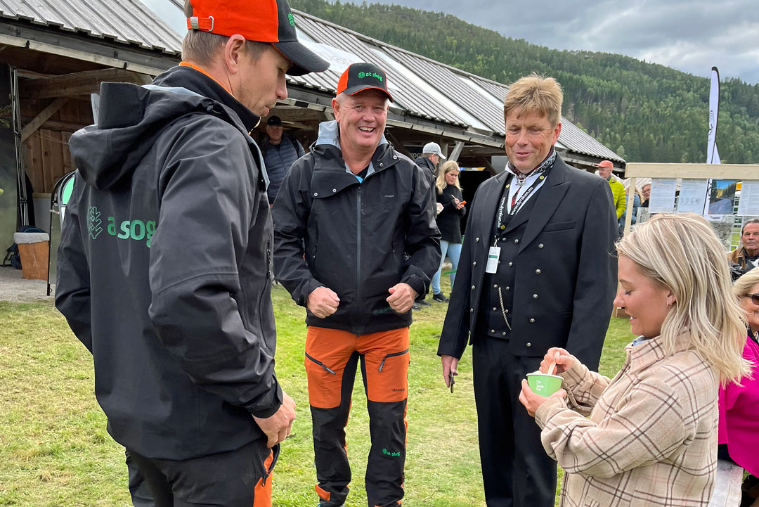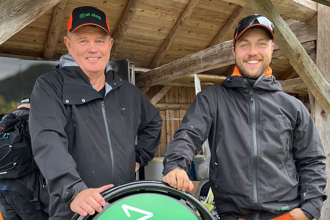 På bildet er det marked- og logistikksjef i AT Skog, Hans Erik Røra (til v) og daglig leder i Skogselskapet i Oppland, Ola Gram Dæhlen, som sørger for serveringen.