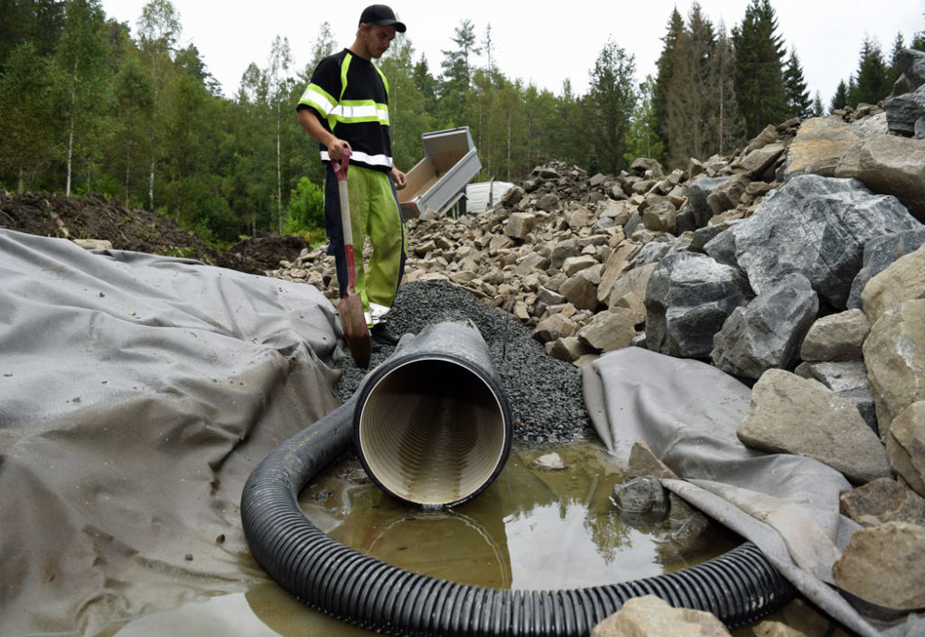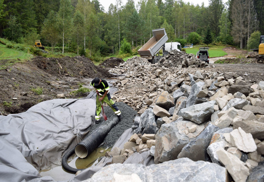 I dette veiprosjektet begynte Christian med å skrape av jorda på den gamle veien før han la på duk. Duken legges på for at jord og leire ikke skal komme opp under press. Deretter la han på et lag med grov stein. Veikantene skal bankes før han legger på det siste laget med veigrus.