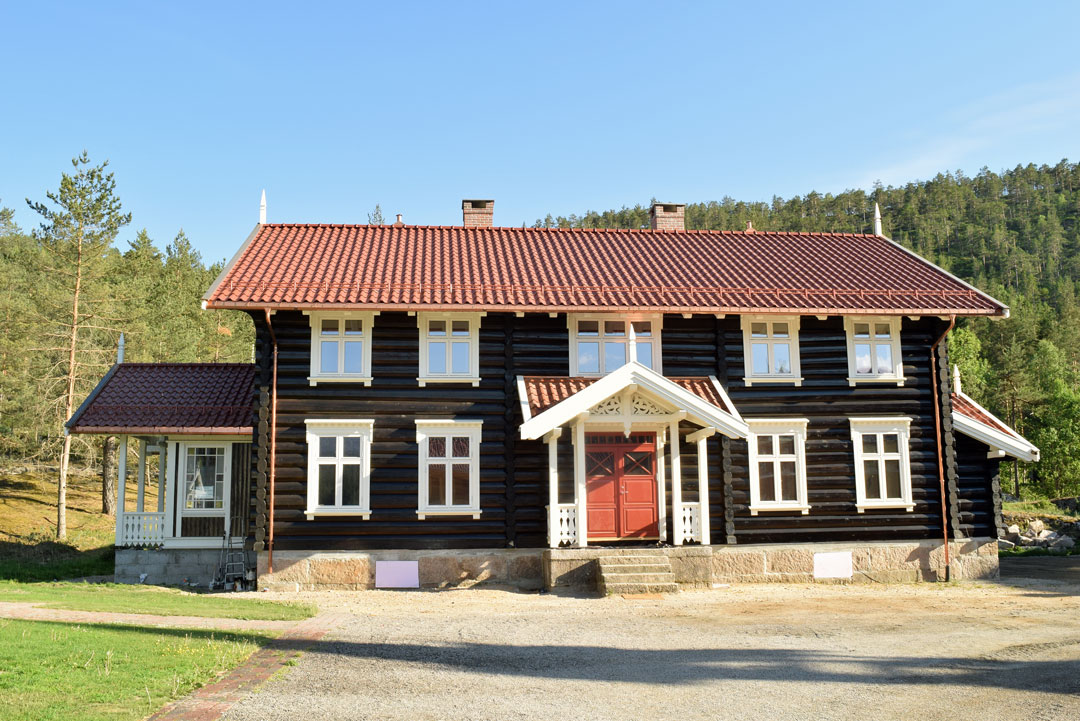 Det eneste huset som ikke brant ned, var hovedhuset. Alle vinduer i dette huset måtte byttes, men ellers slapp det unna flammene. Tømmerhuset i sveitserstil er bygd opp på den gamle grunnmuren. Utskjæringene er resultat av arkitektens kreativitet, gamle bilder og familien Rambergs historie med skogsdrift, egg, korn og hest.