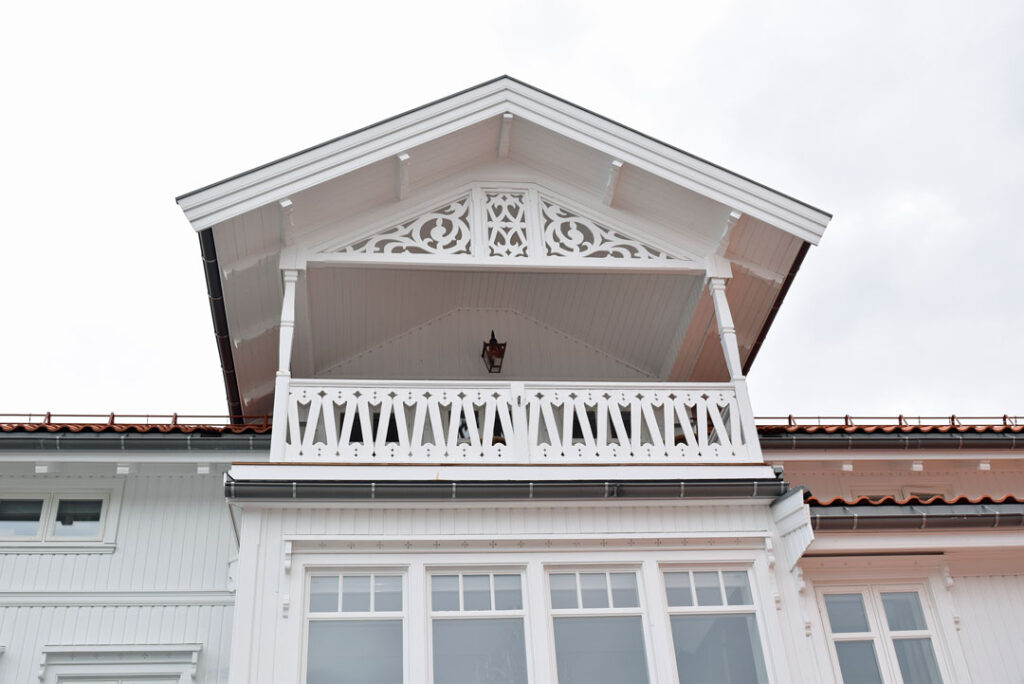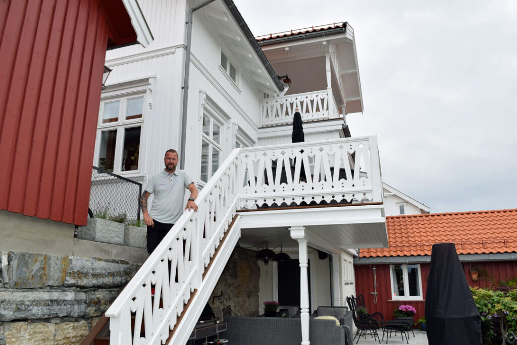 – Alt er i malmfuru. Rekkverk, mønepynt og søyler er håndskåret. Det gjorde jeg selv og tipper det tok rundt 100 timer. Jeg sparte en del på det. I tillegg synes jeg det var en morsom fritidssyssel. Sperreføttene oppunder taket er originale, mens all belistning og kledning er kopi av det originale, sier Frederik Mustad, som har alt han trenger i og rundt huset for å nyte sommeren.