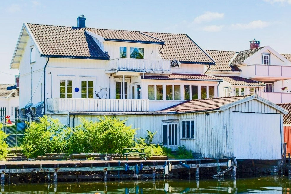 – Målet var at huset skulle se ut som det hadde stått der bestandig. Fortidsminneforeningen var skeptisk, men er blitt kjempefornøyd. Vi har fått mye positiv respons ettersom huset ble mer og mer ferdig, sier Frederik og viser vei til brygga. Derfra ser vi opp på en glassveranda og sveitserpynt.