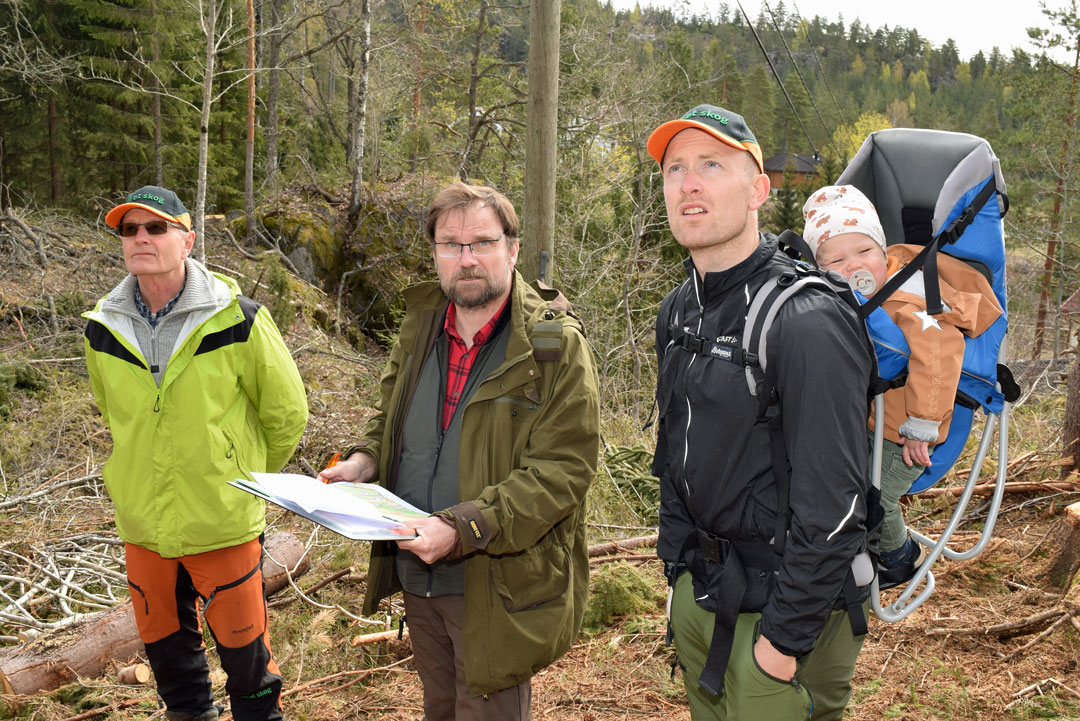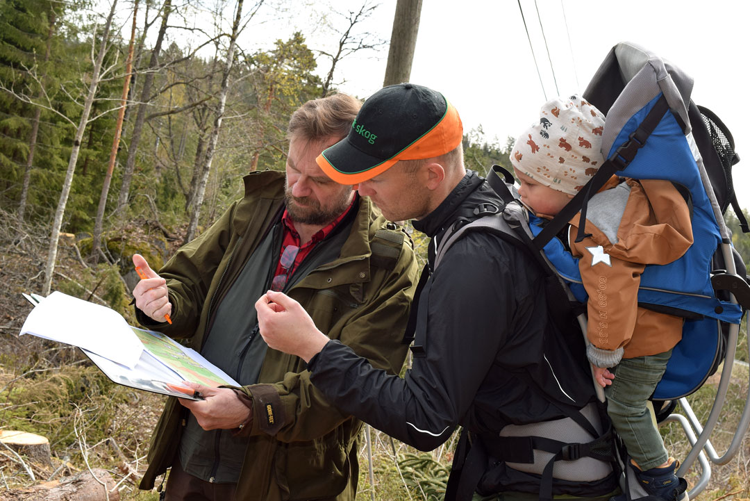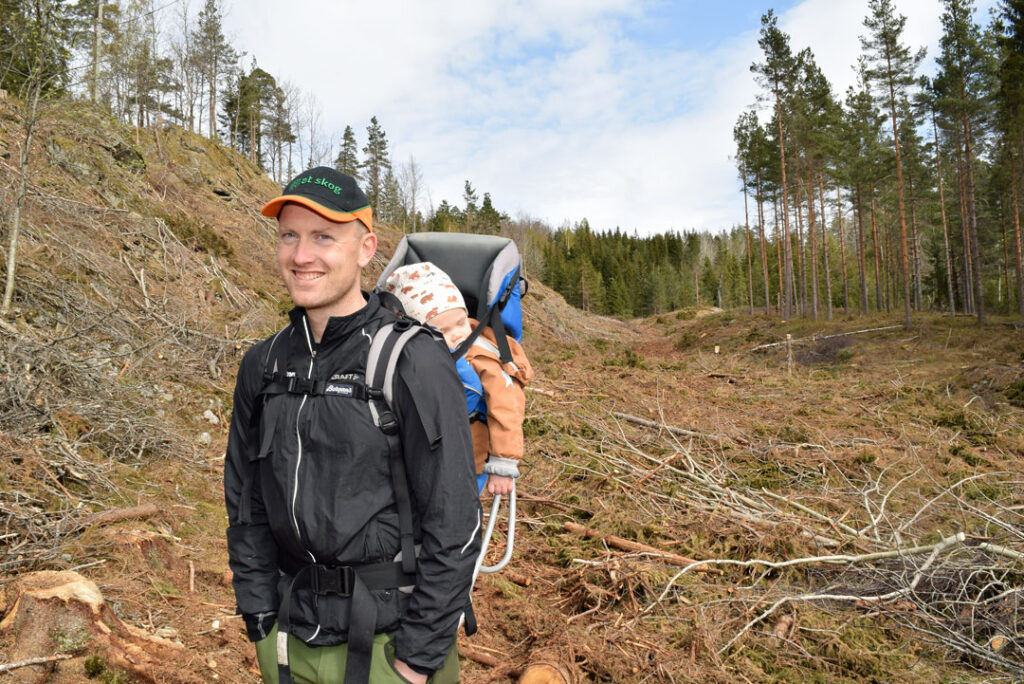 – Jeg begynte tidlig å bli med far i skogen og fikk prøve meg med motorsag da jeg var 12. Jeg gjorde nok ikke alt riktig, men fikk lov å prøve, sier Terje, som også er skogutdannet. I bæremeisen sitter Tellev tålmodig under revisjonen.