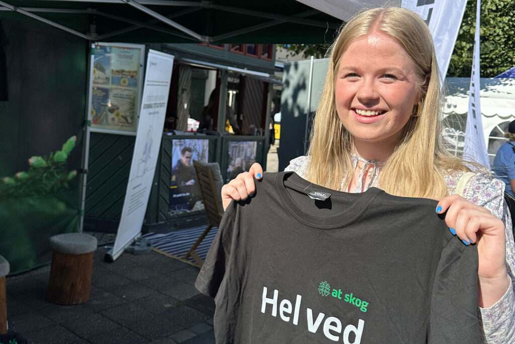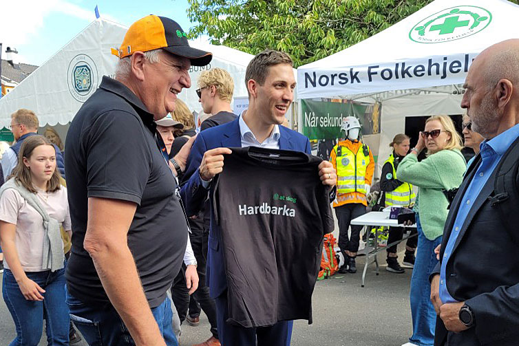 Geir Pollestad, landbruks- og matminister (Sp), og klima- og miljøminister Andreas Bjelland Eriksen (Ap) var begge innom AT Skogs stand og fikk høre om granulat av bjørk. I tillegg fikk Jan Ivar delt ut en tskjorte med et hardbarka budskap til Bjelland Eriksen.