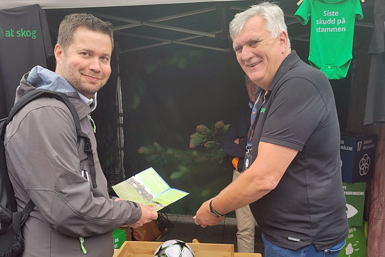 Teamleder for frivillig vern, Jan Ivar Rødland, og servicemedarbeider Maria Töllbäck Sannes (hovedbilde) tok viktig skogprat med alle som stoppet opp og fattet interesse for fotballen og de små granplantene, som innledet til samtaler om skogbruk som klimaløsning og hvordan vi utfører hogst etter PEFC.