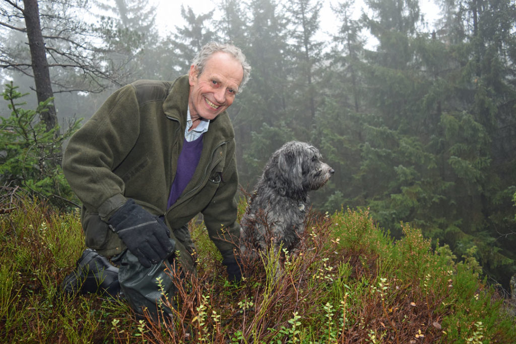 Ut av bilen til skogeieren hopper Bobby, en blandingshund med kongepuddelkrøller.