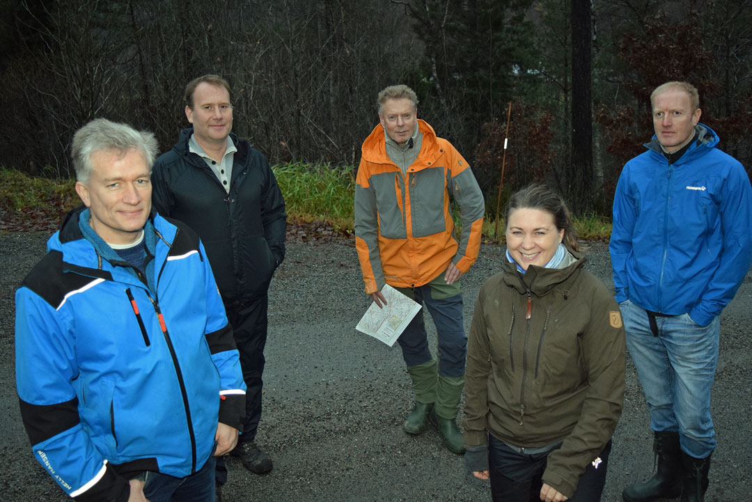 På bildet til venstre: Leder av styringsgruppa for ny skogbruksplan og skogeier, Trygve Haugeland (fra v), skogeier Ståle Haukelid, skogbruksplanlegger Yngvar Hannevik i AT Skog, overingeniør Una Glende Janson hos Fylkesmannen i Agder og skogbrukssjef i Hægebostad, John-Ivar Bjelland.