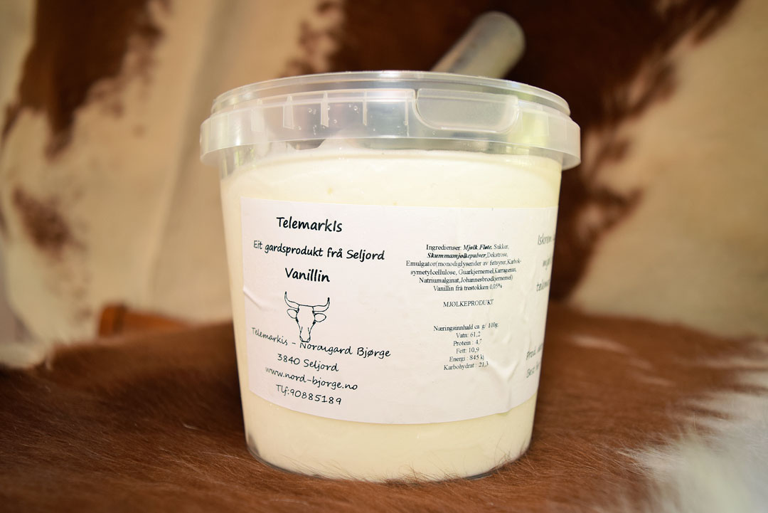 Hanne Årlid bor på Nordigard Bjørge gjestegård med mann og tre barn. Rett over tunet bor svigerforeldrene Leiv og Solrun Bjørge. De har produsert is av melk fra egne telemarkskyr siden 2006.