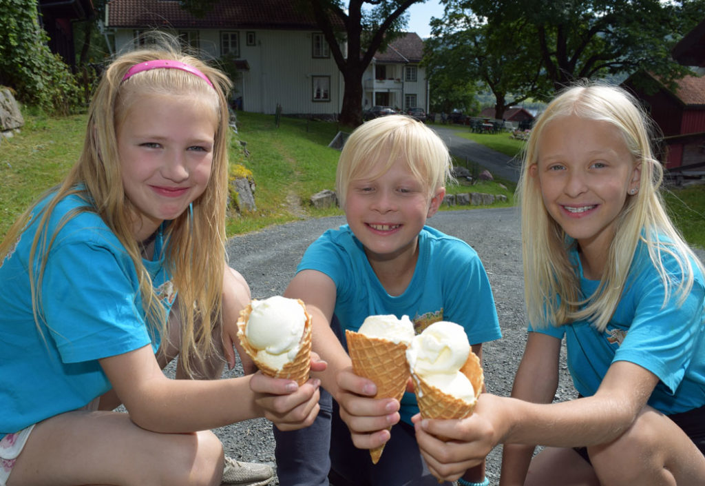 Barna på Nordigard Bjørge får nesten spise så mye is de vil. Sier mamma Hanne Årlid nei, bekrefter datteren Ingebjørg og vennene Eivind og Eline, at løsningen er å spørre besteforeldrene Solrun og Leiv.
