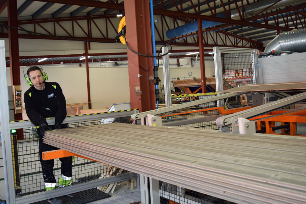 – Inne i hallen slipper vi å tenke på om været er godt nok til å male huset. Det er enda en fordel med å bestille ferdigmalt. Du risikerer ikke fuktproblemer og maling som flasser av etter malingsjobb i variabelt vær. Etter at kledningen kommer ut av sprøyteboksen med ett strøk, går ferden videre til tørking. Etter fire – fem minutter kommer kledningen ut i andre enden tørr og klar for et nytt strøk.