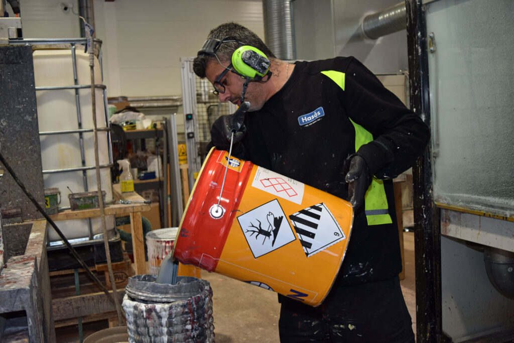 I malingsanlegget hos Hasås har malingsdysene og sprøyteboksen blitt renset og klargjort for ny farge i normalt tempo det siste året, tross den lave byggeaktiviteten. Når husbyggingen tar seg opp igjen, skal det ikke stå på leveringstid og rask respons.