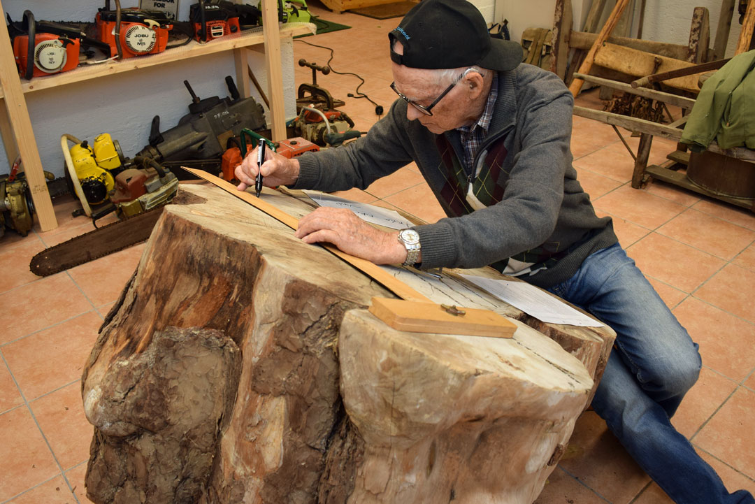 – Godt syn og tålmodighet må til, sier Jarl Bakken over den enorme kubben etter furua, som ble felt i Drangedal i 1929.