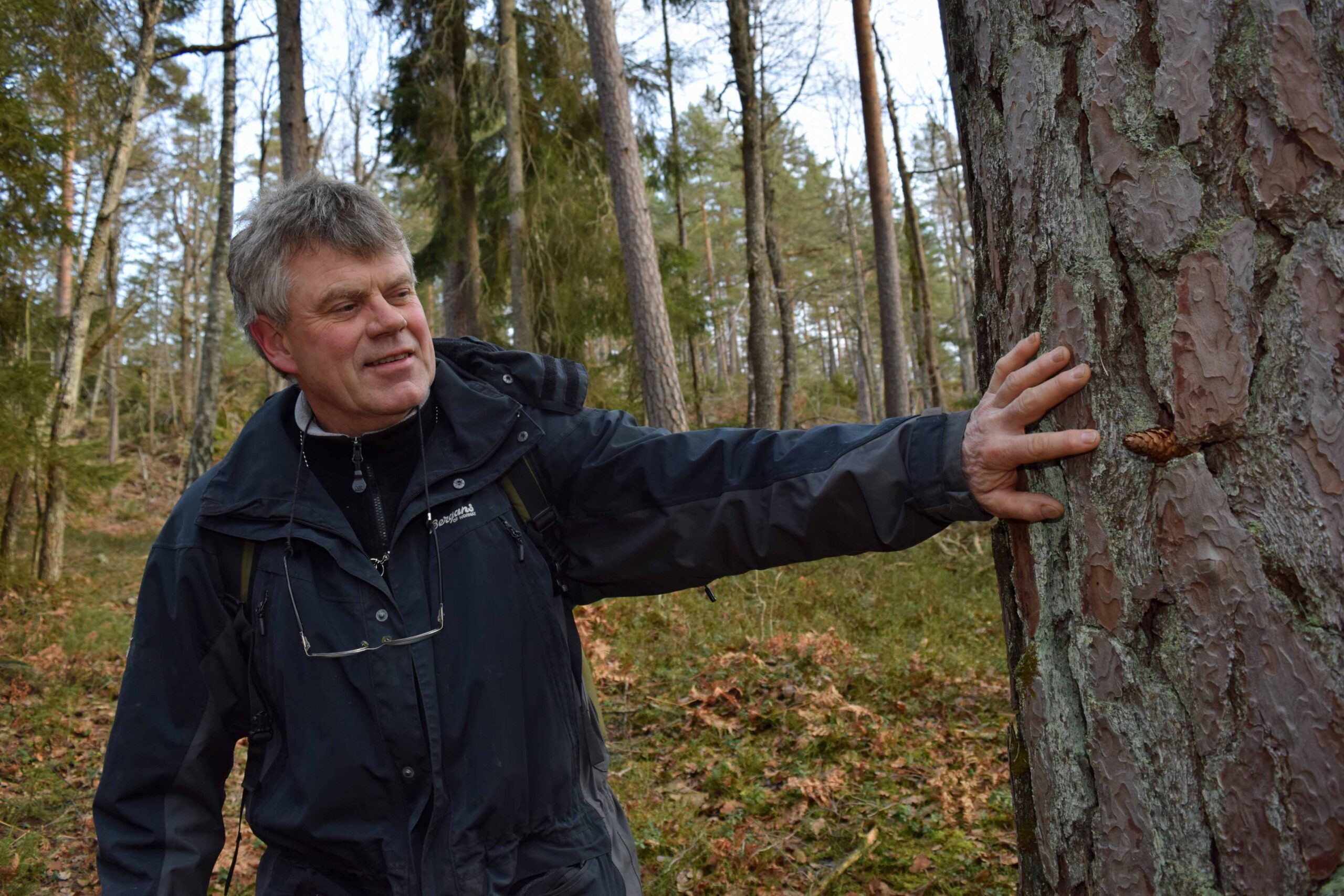 – Det siste tømmeret jeg drev ut på denne halvøya, var 1500 m³ i 2004. Da ble maskinene fraktet med lekter, tømmeret fløtet 4 kilometer og deretter lastet opp på brygge med mobil tømmerkran. På 1980-tallet levde jeg av skogsdrift, men det er ikke mulig i dag. Interessen for skog arvet jeg av faren min, forklarer skogeieren, mens han går opp skråninger og ned gamle traktorveier.