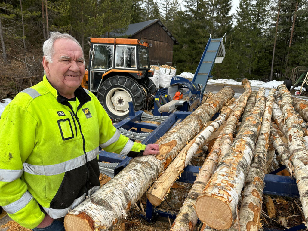 Hver ledige time jobber Bjørn Tørnes med ved med gammel traktor og ny vedmaskin.