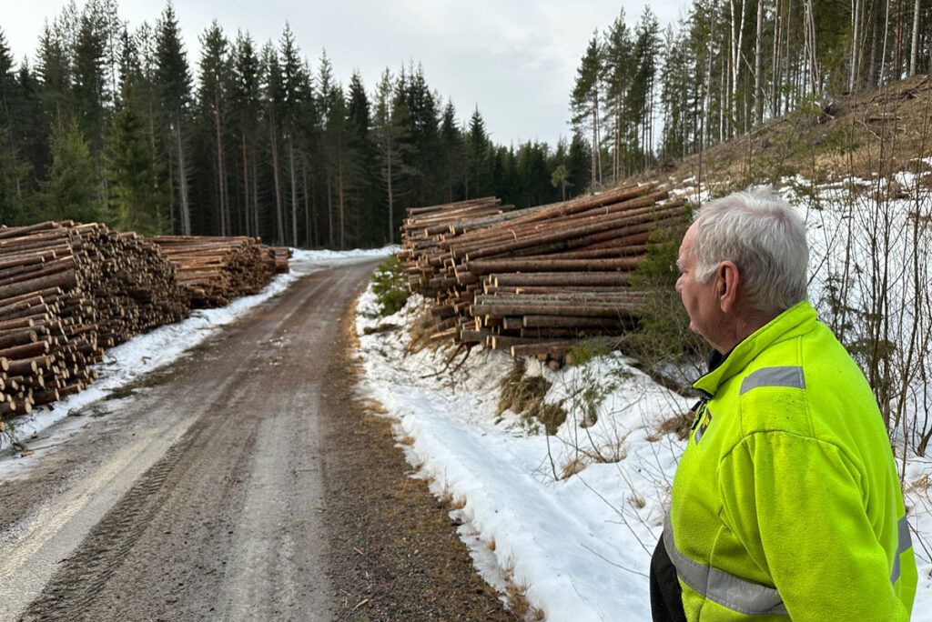 Langs skogsbilveien ligger tømmer som er felt av tynningslaget. Gode tømmerpriser gjør tynning ekstra attraktivt. – Men jeg ville tynnet uansett for å få en god framtidsskog, sier skogeier Bjørn.