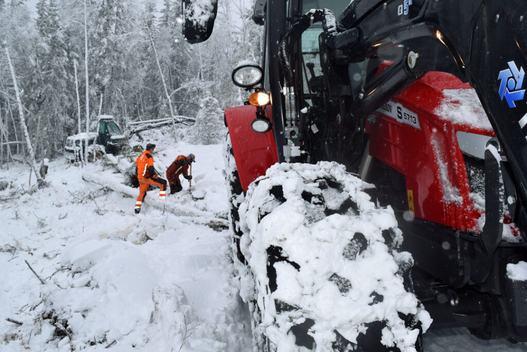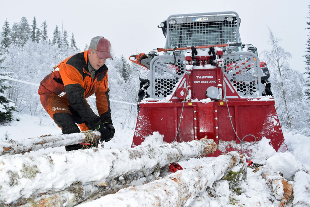En kilometer oppi lia vinsjer han inn opptil 12 stokker. Noen setter seg fast. Motorsag må til for å kappe et par stokker løs. Det snør tett.