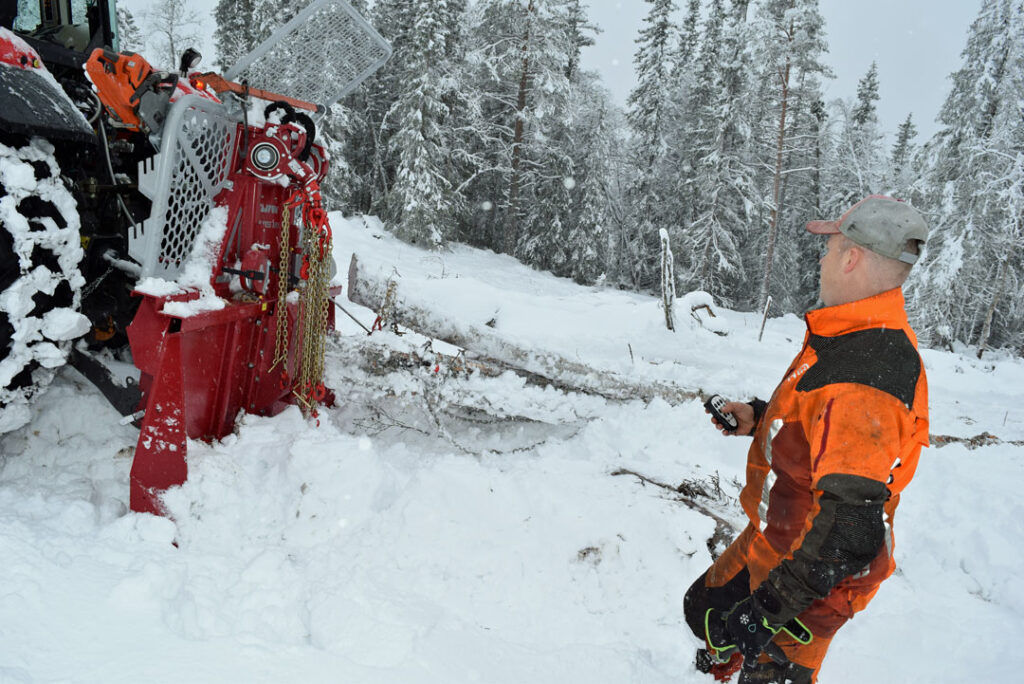 – Jeg jobber ikke i skogen når det er mørkt. Da bruker jeg heller tiden på å kappe tømmeret jeg har fraktet ned til leggeplassen, forklarer han.