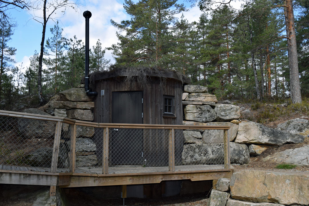 Åtte sengeplasser, toalett, kjøkken, spiseplass og terrasse mellom 4 til 5 furutrær er fordelt på mange etasjer med kreative løsninger.
