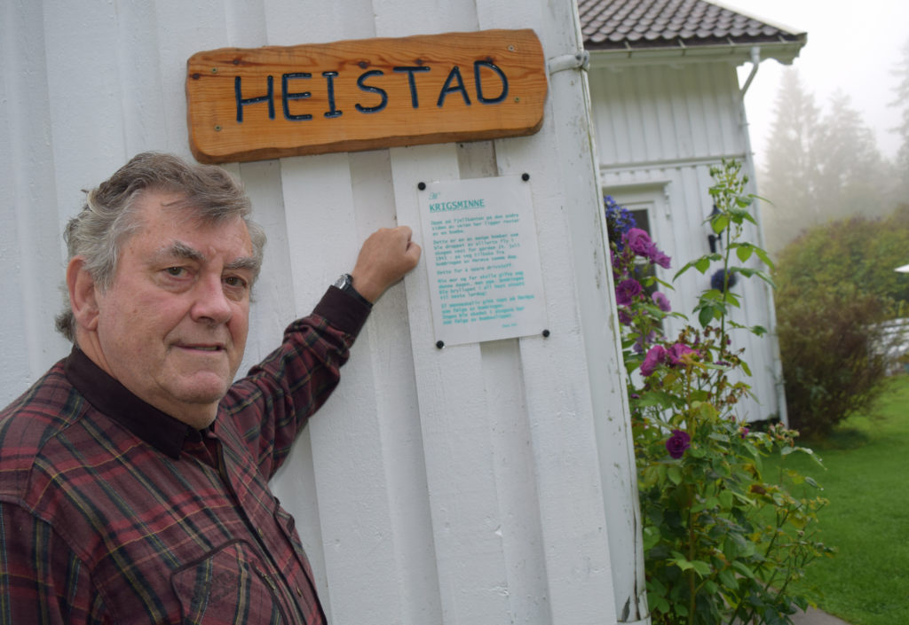 Han snakker med mange av dem. Bare hyggelige folk, forsikrer skogeieren på tunet. Den første infotavlen henger på husveggen hans. Den forklarer hvordan foreldrene måtte utsette bryllupet i 1943 da Norsk Hydro plutselig ble bombet. En rusten del av en bombe ligger rett ved huset.