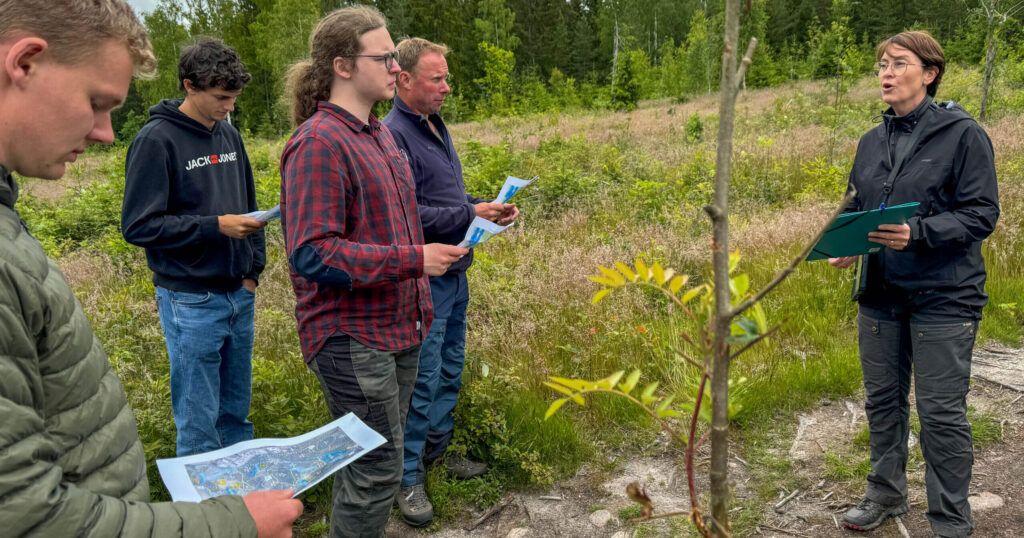 Studentene hadde mange spørsmål og fulgte ivrig med når Ann Kristin og Magnus snakket om hvor viktig det er å stelle den nye skogen som kommer opp, og hvilke hensyn skogbruket tar til både friluftsliv og biologisk mangfold når det hogges.