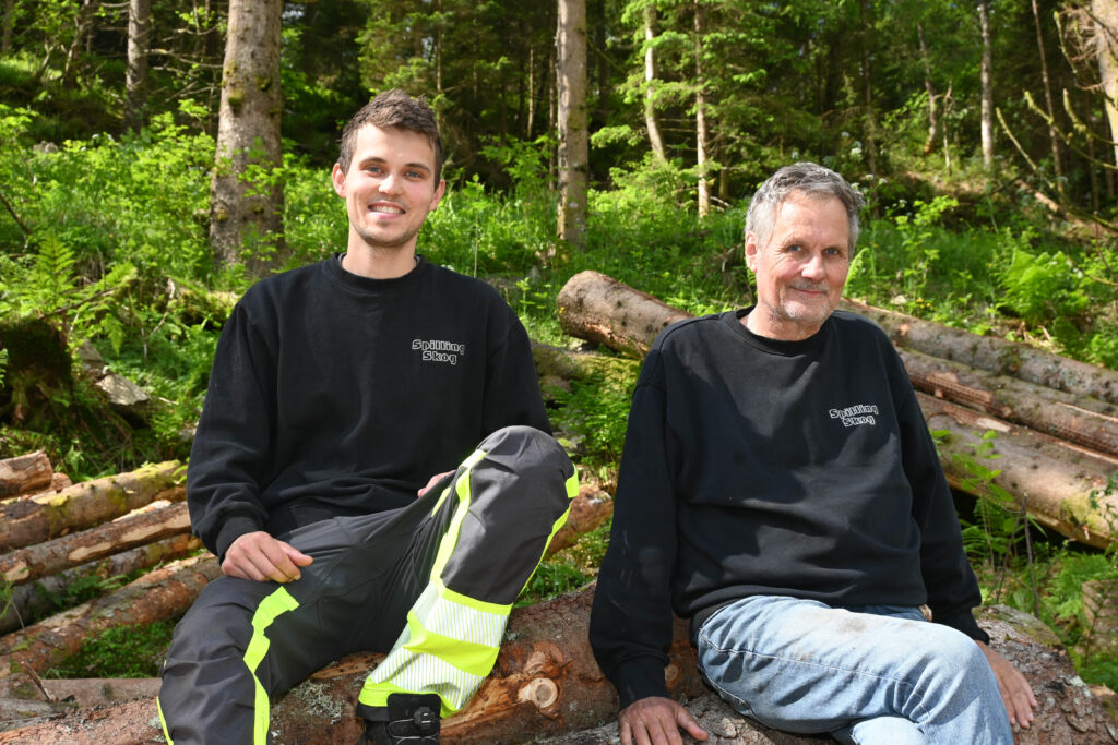 På en hogst i Lindesnes er entreprenørfirmaet Spilling Skog i gang med dagens økt. I hogstmaskinen feller Alf Olav (28) trær, mens Tor Inge (64) kjører tømmerstokkene ut av skogen til velteplassen.