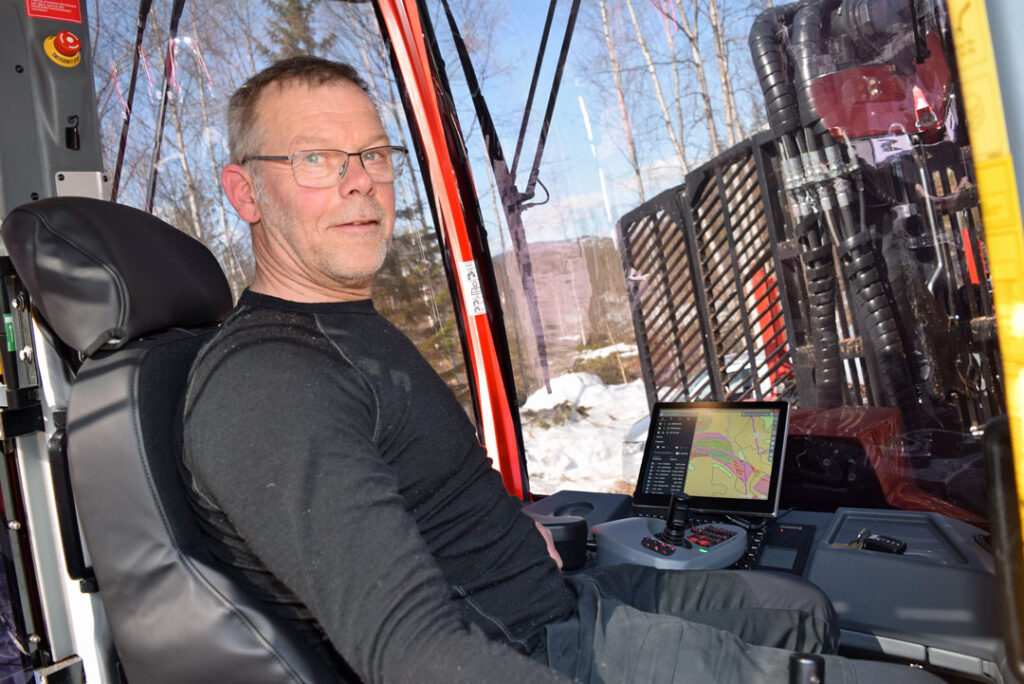 – Den er mer behagelig og reagerer kjapt på ønsket bevegelse. Det er mer demping i setet og i hytta. Det er viktig, for vi sitter mange timer i uka i maskinen. Du finner ikke en kontorstol som er bedre enn denne stolen jeg sitter i, konkluderer han på en liten visning inn i førerhytta.