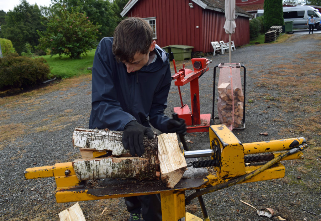 Martin jobber med manuell hydraulisk vedkløyver. Han er ivrig der han pumper opp trykket i vedkløyveren før han kan presse kubben i fire. Amund liker best å bruke sag. Det gjør Linda, også.