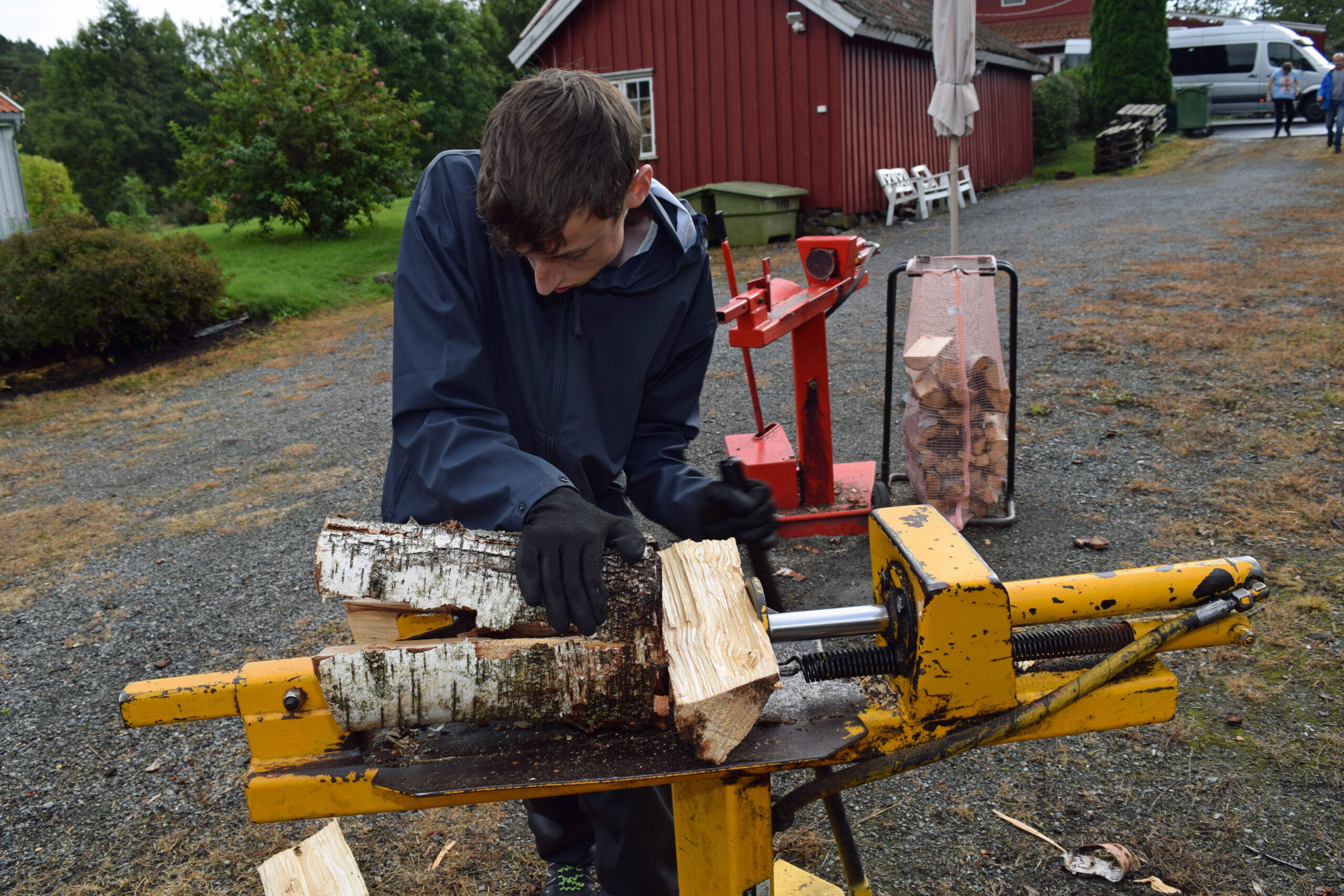 Martin jobber med manuell hydraulisk vedkløyver. Han er ivrig der han pumper opp trykket i vedkløyveren før han kan presse kubben i fire. Amund liker best å bruke sag. Det gjør Linda, også.