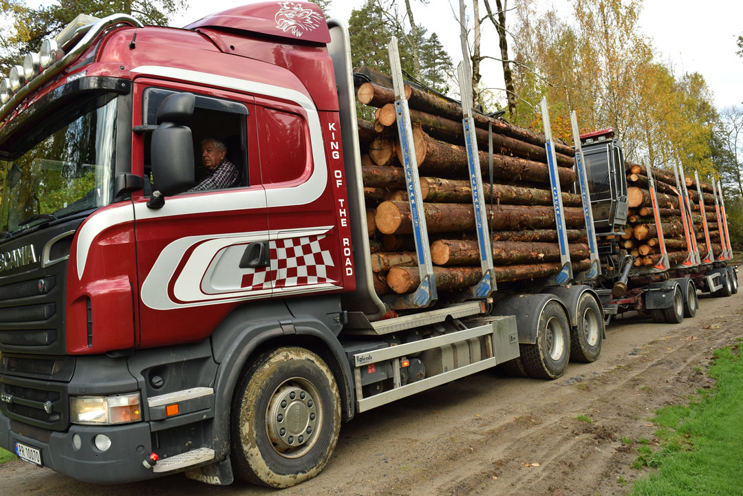 Den vinrøde Scania tømmerbilen, som han kjøpte brukt i 2012, er merket med «King of the road» på førerhuset.