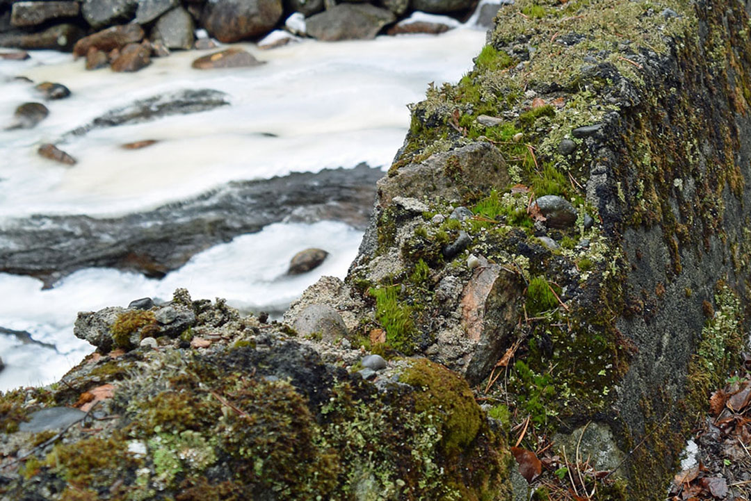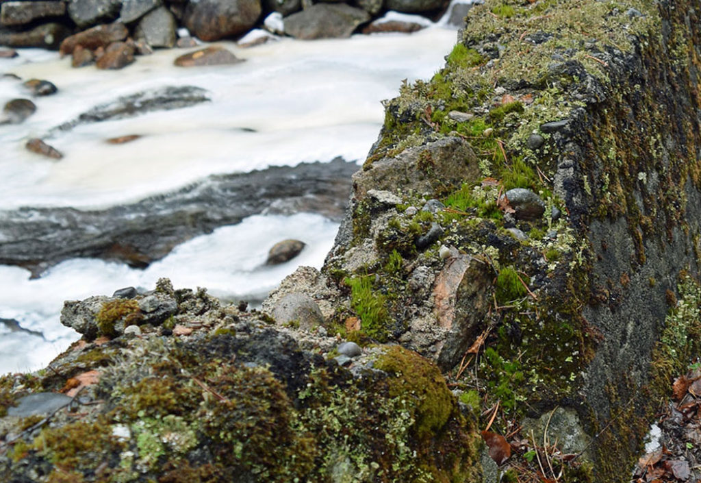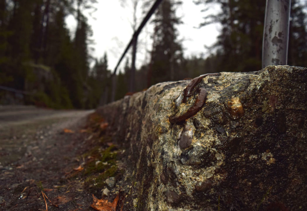 Brukantene, som er en blanding av betong og stein, er enkelte steder porøs og masse ramler ut når Hans tester kanten med støvelen.