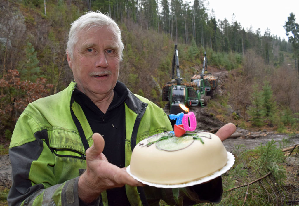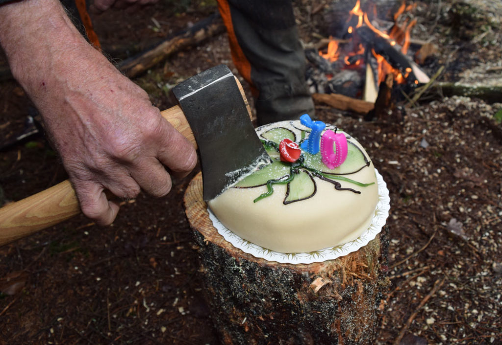 Da skogsmaskinføreren ble overrasket med marsipankake på jobb langt inn i skogen, måtte øksa duge som kakespade.