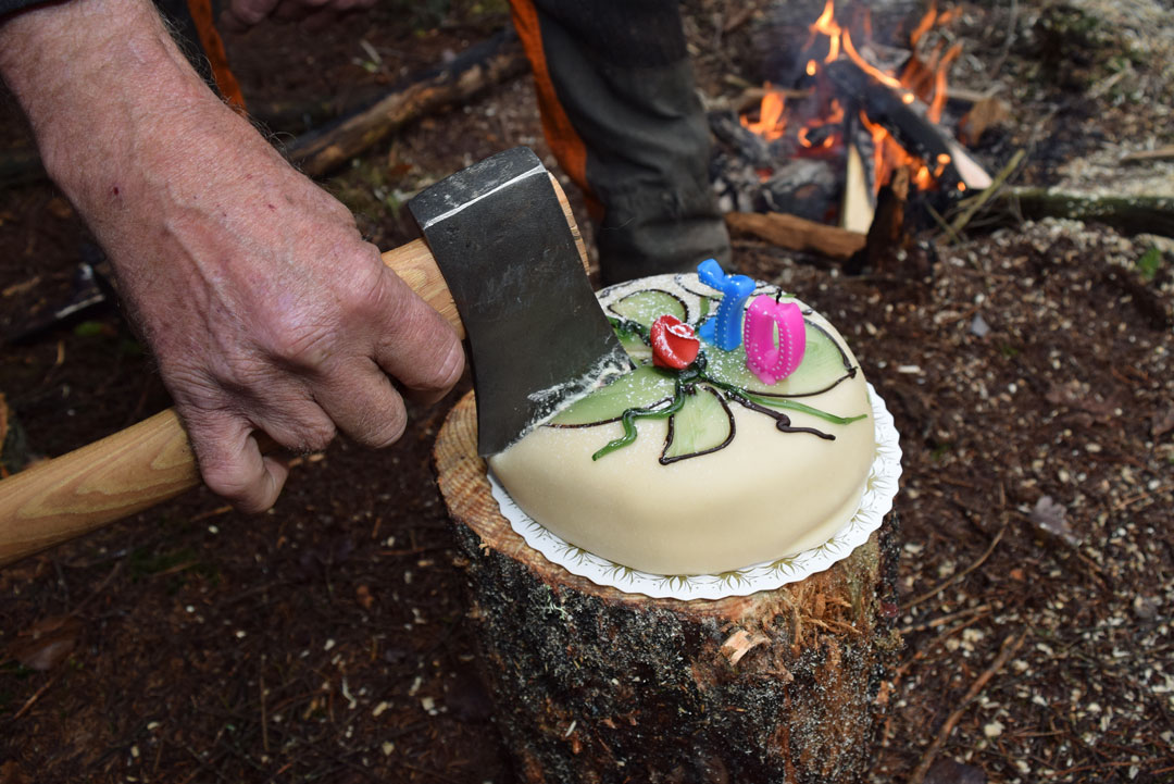 Da skogsmaskinføreren ble overrasket med marsipankake på jobb langt inn i skogen, måtte øksa duge som kakespade.