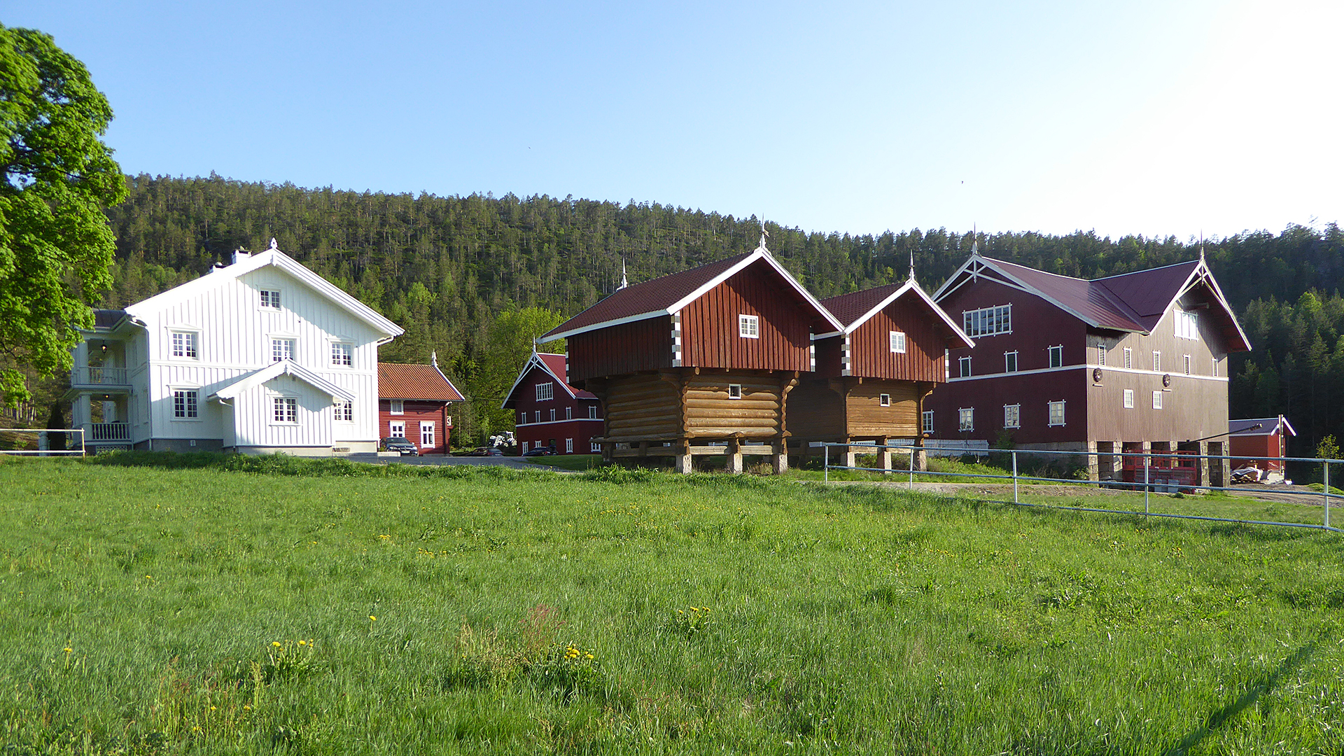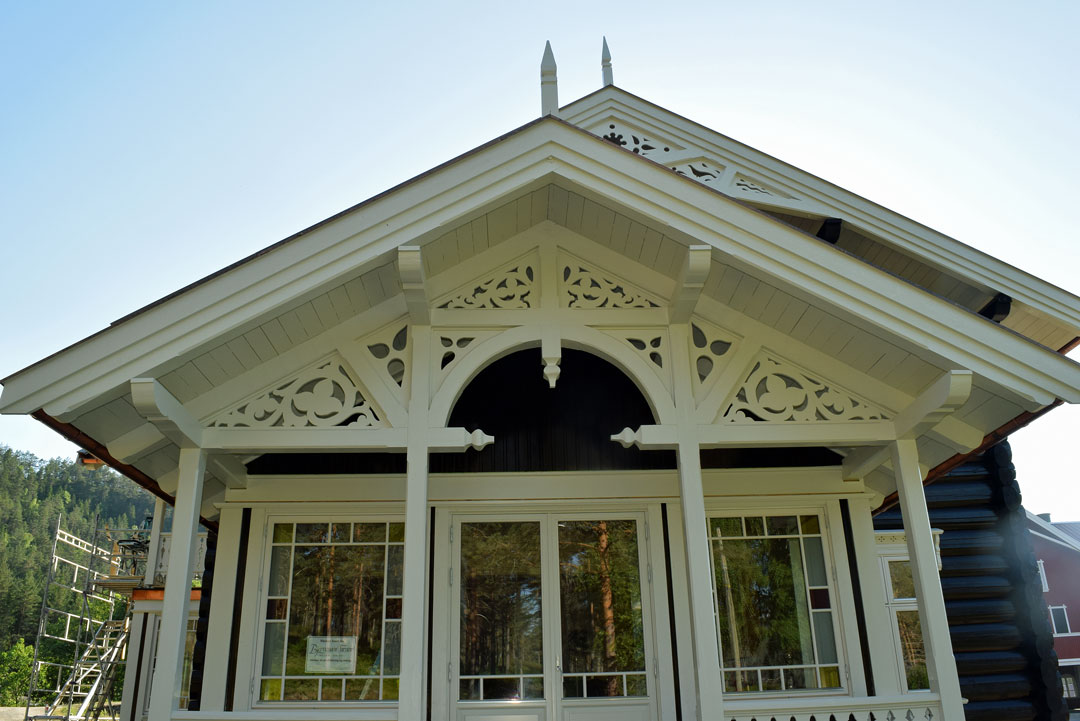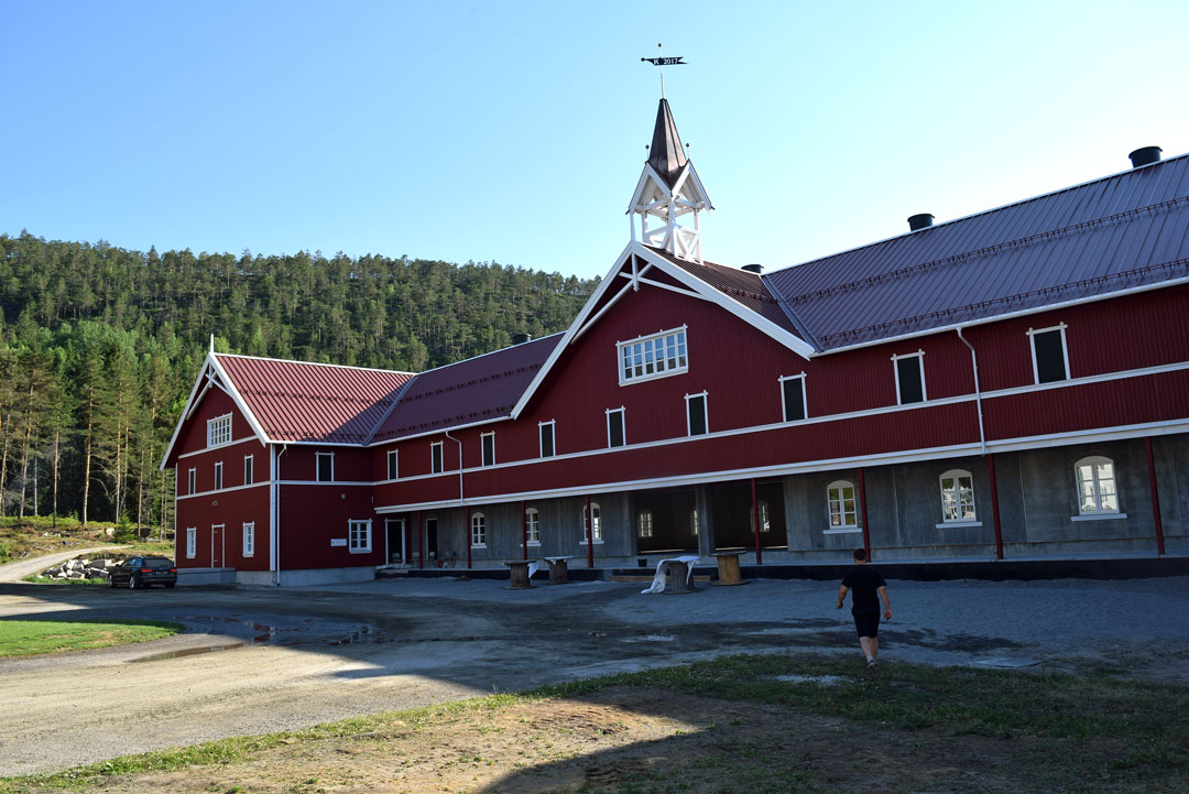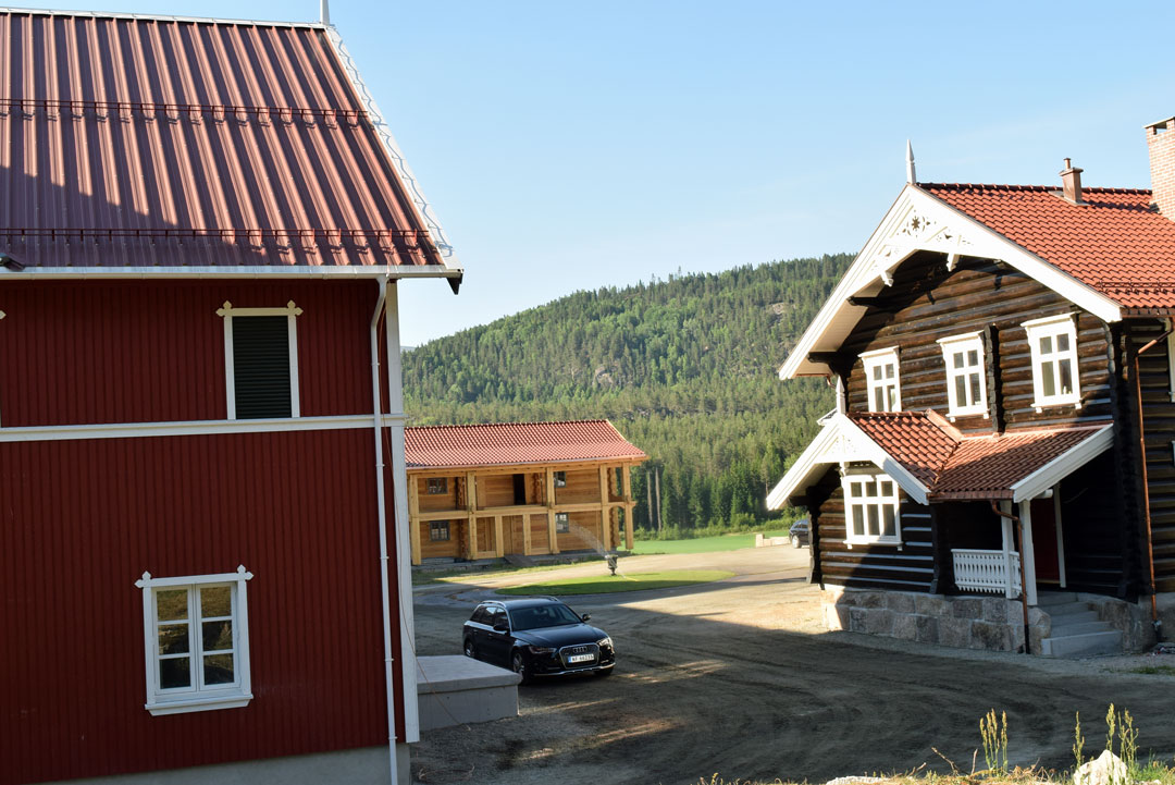Det eneste huset som ikke brant ned, var hovedhuset. Alle vinduer i dette huset måtte byttes, men ellers slapp det unna flammene. Tømmerhuset i sveitserstil er bygd opp på den gamle grunnmuren. Utskjæringene er resultat av arkitektens kreativitet, gamle bilder og familien Rambergs historie med skogsdrift, egg, korn og hest.