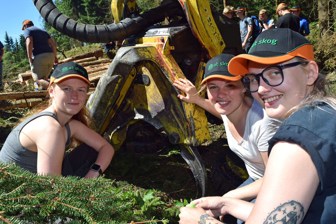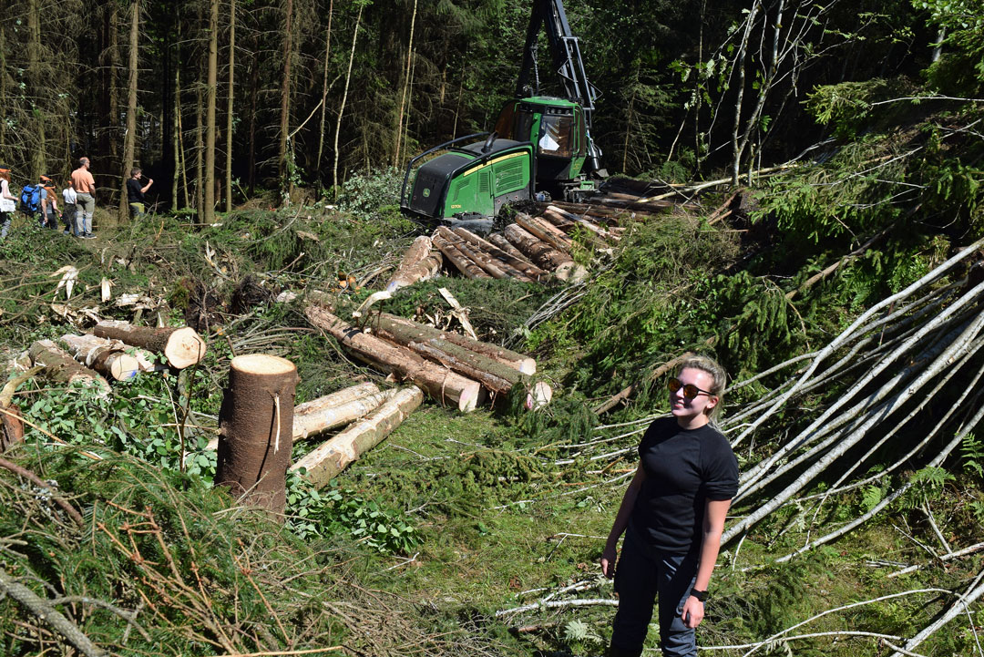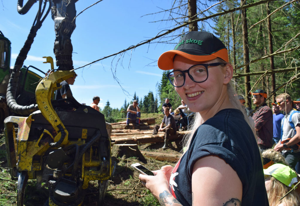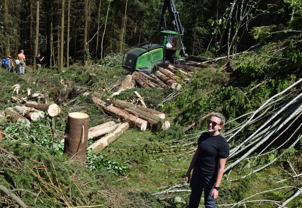 – Dette er en drift på 1500 kubikk. Vår jobb er å følge opp entreprenørene og hver enkelt tømmerkontrakt. Hogstmaskinen håndterer 5 meter per sekund, så maskinføreren må ta kjappe avgjørelser. I denne drifta kan det hogges 150 til 200 kubikk daglig, forklarte Thomas foran hogstmaskinen.