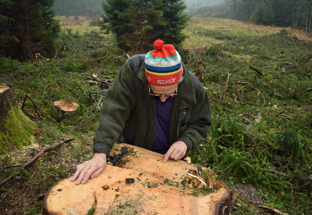 Skogeieren er begeistret og overrasket. Skogen som moren fikk plantet i 1956 står tett og hogstklar så langt øyet kan se.
