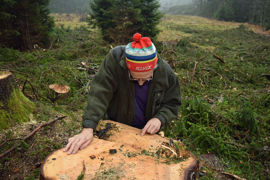 Skogeieren er begeistret og overrasket. Skogen som moren fikk plantet i 1956 står tett og hogstklar så langt øyet kan se.