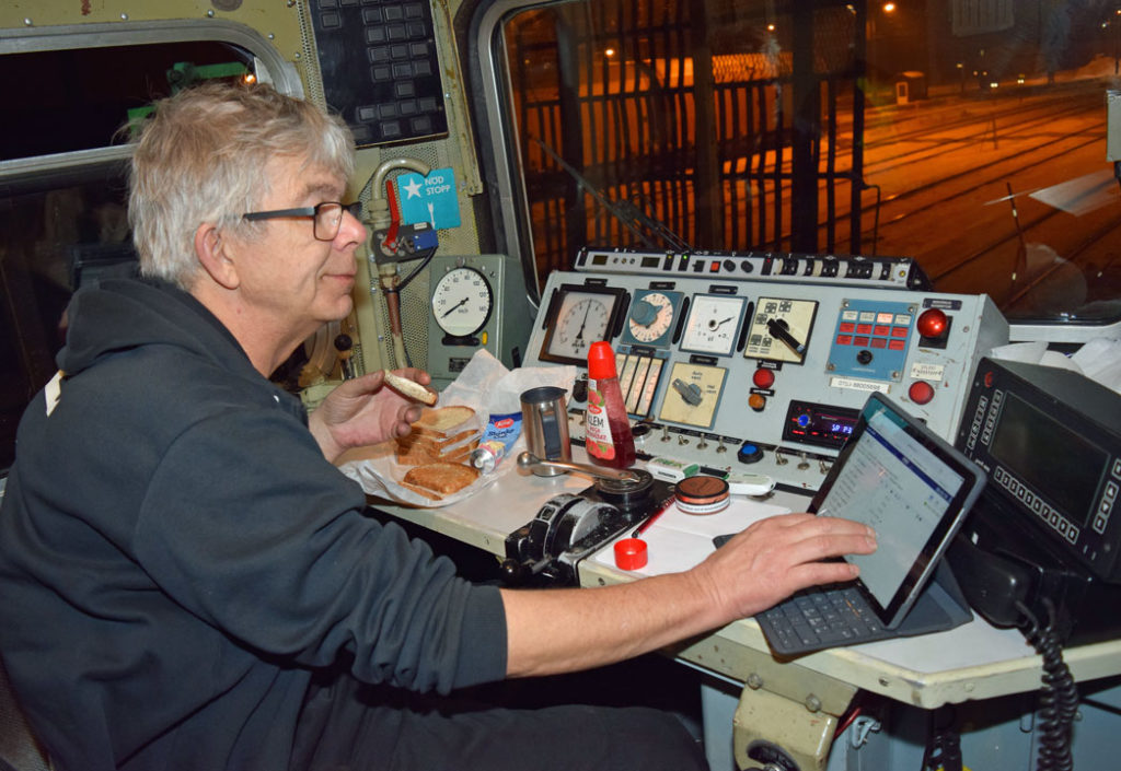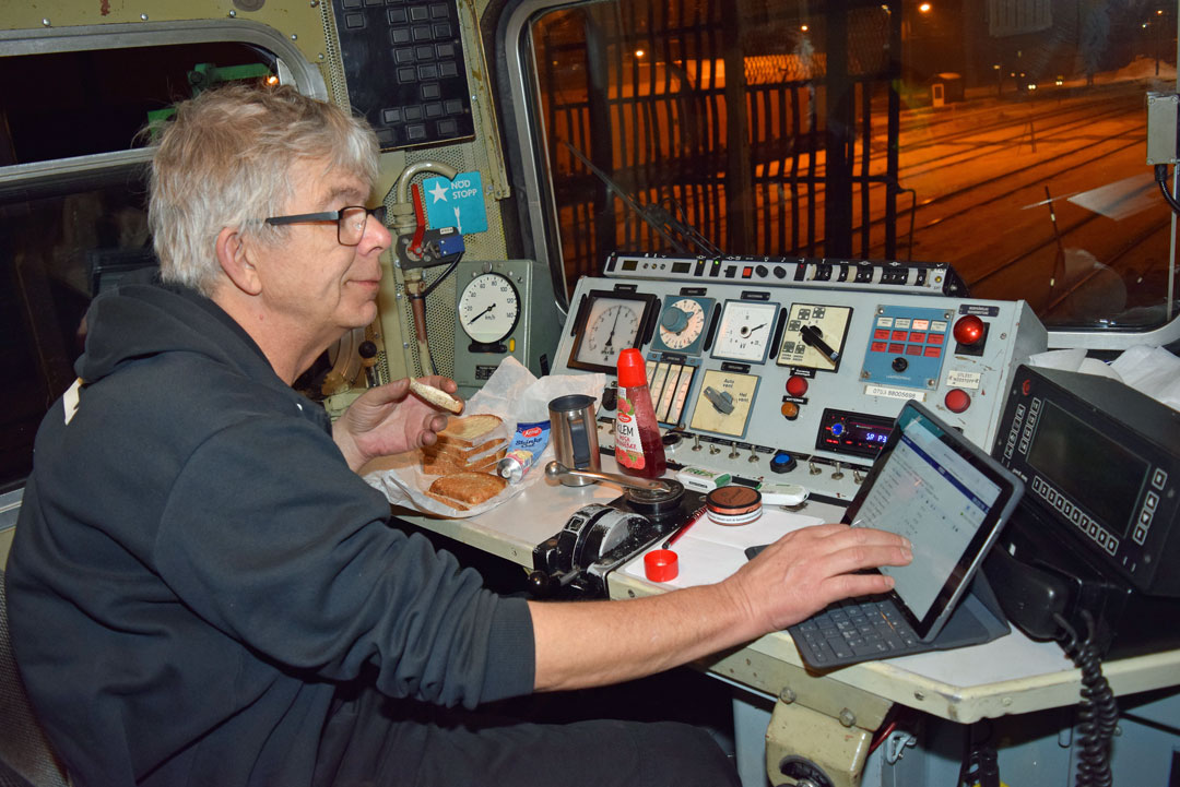 – Som lokfører lærer du deg å sove i alle mulige vinkler, konkluderer Hans Kristian, mens han pakker ut nistepakken med en solid bunke brødskiver. Han er klar for 10 timers arbeidsøkt.