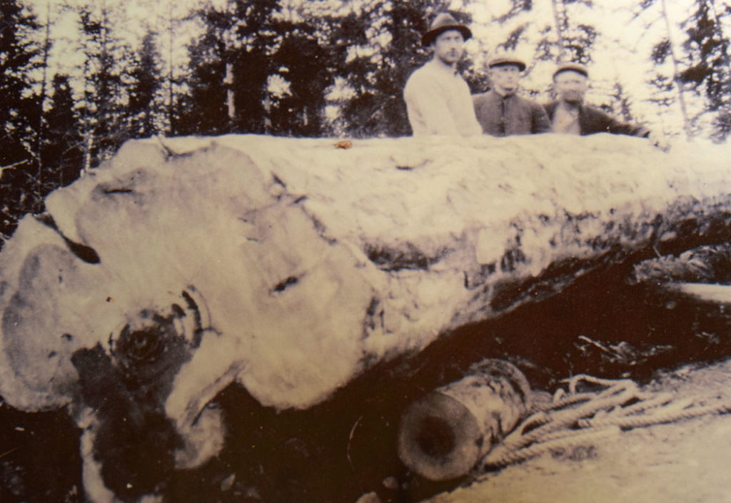 – Godt syn og tålmodighet må til, sier Jarl Bakken over den enorme kubben etter furua, som ble felt i Drangedal i 1929.