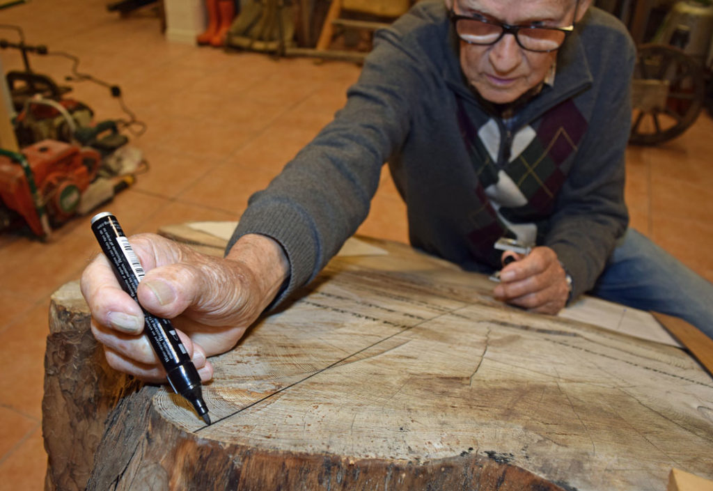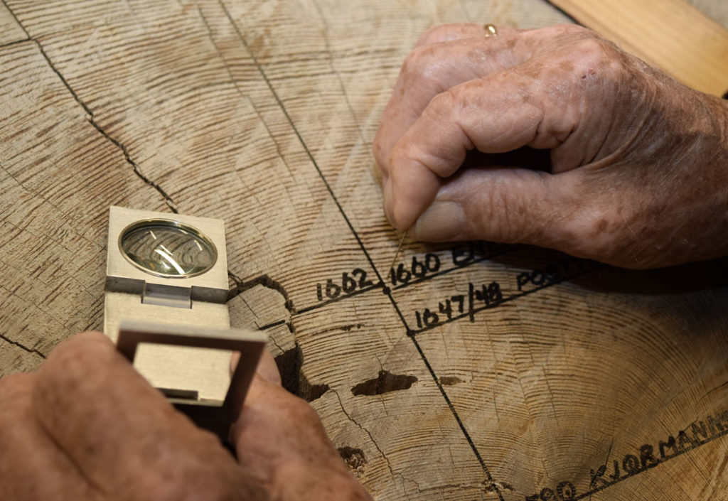 – Jeg setter en knappenål for hver 10. årring, forklarer han mens han teller seg utover på kubben.