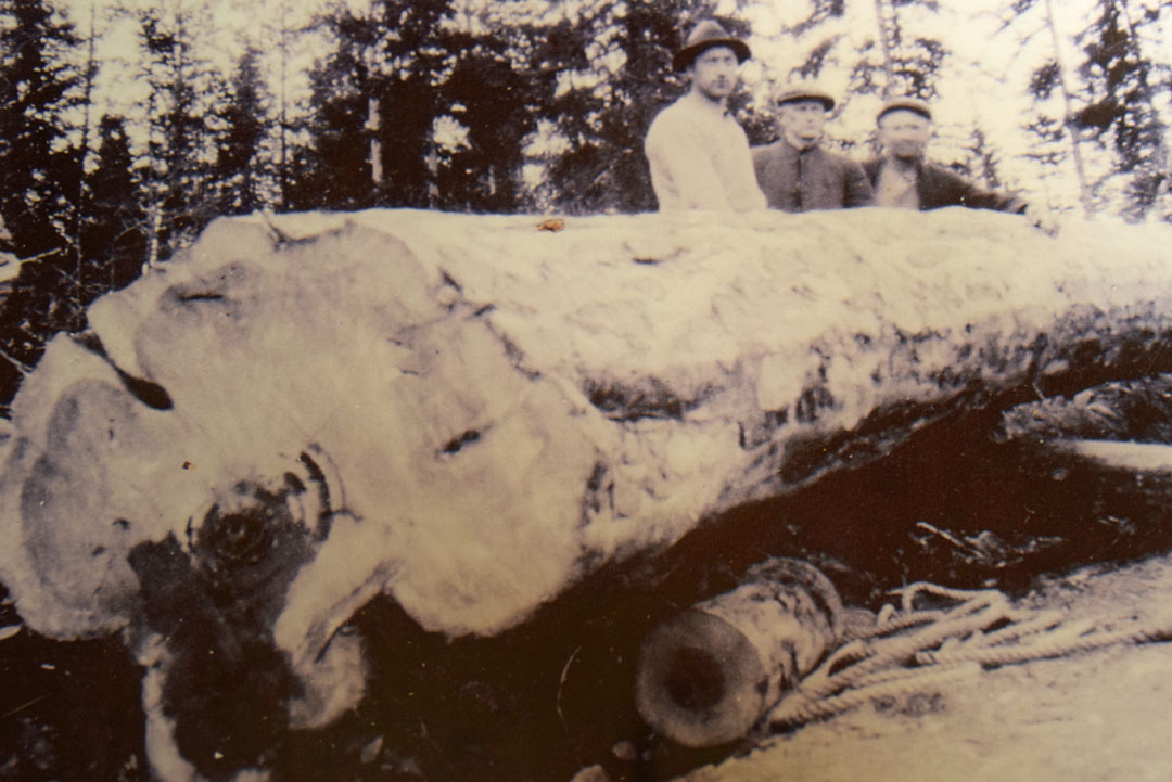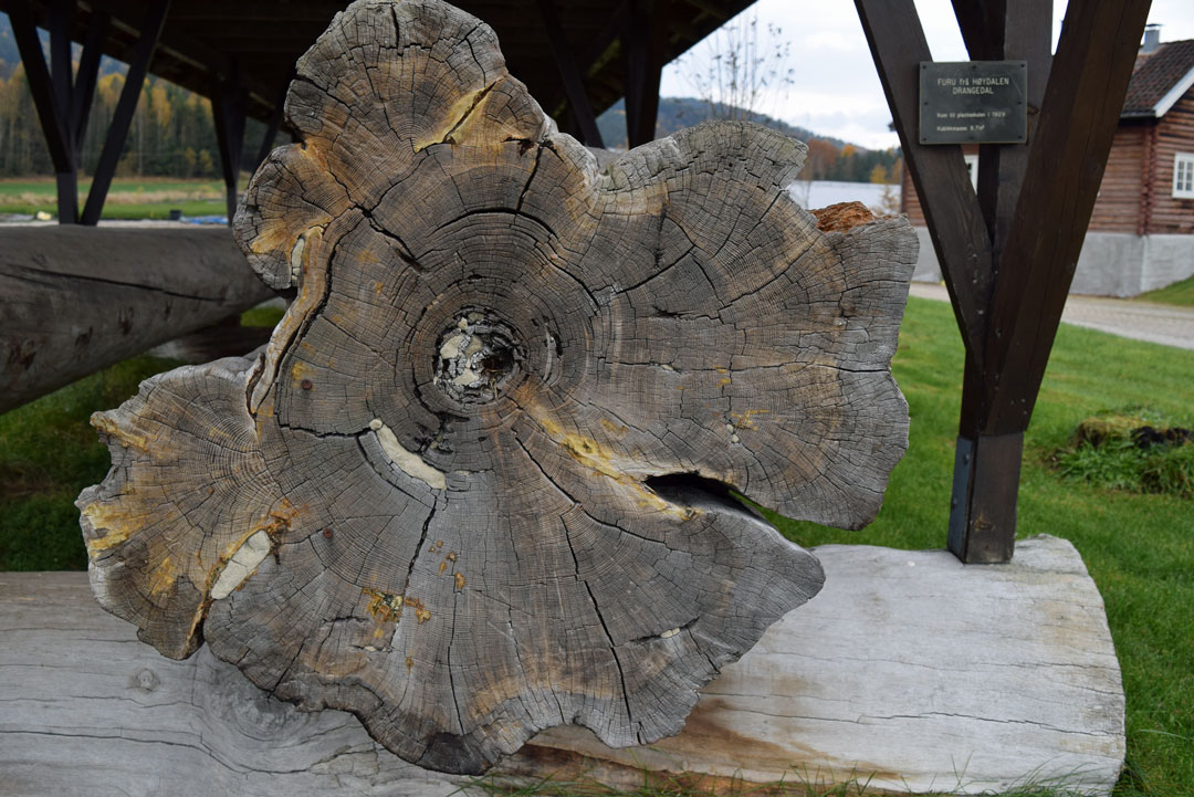 – Godt syn og tålmodighet må til, sier Jarl Bakken over den enorme kubben etter furua, som ble felt i Drangedal i 1929.