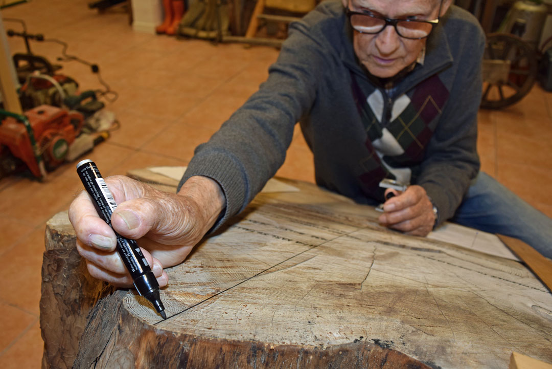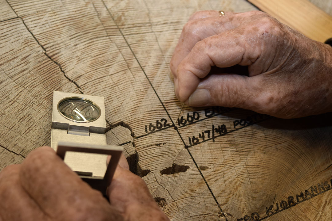 – Jeg setter en knappenål for hver 10. årring, forklarer han mens han teller seg utover på kubben.