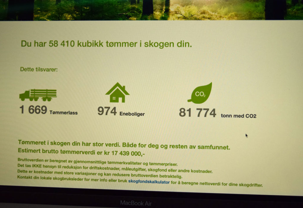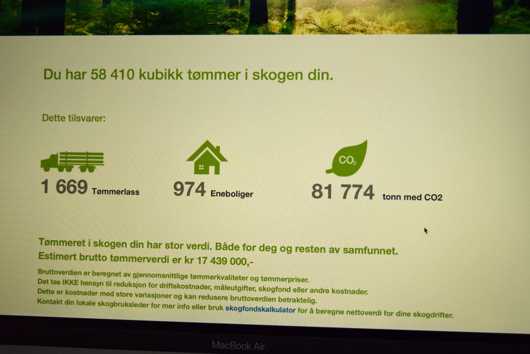 Åpningsbildet i skogbruksplanen Allma, er fakta om skogens bidrag til samfunnet, som at Magnhild har tømmer til 974 eneboliger. I tillegg ser hun at skogen binder nesten 82 000 tonn CO₂.