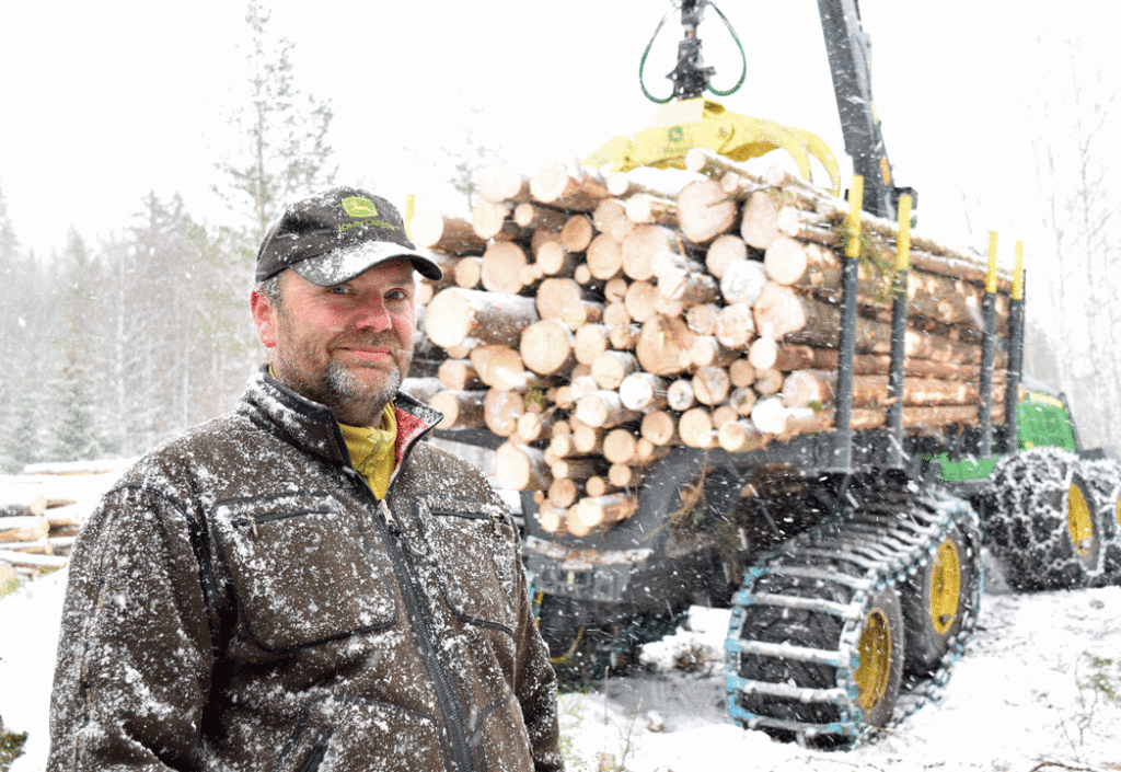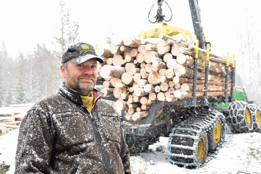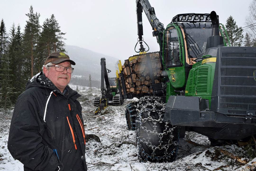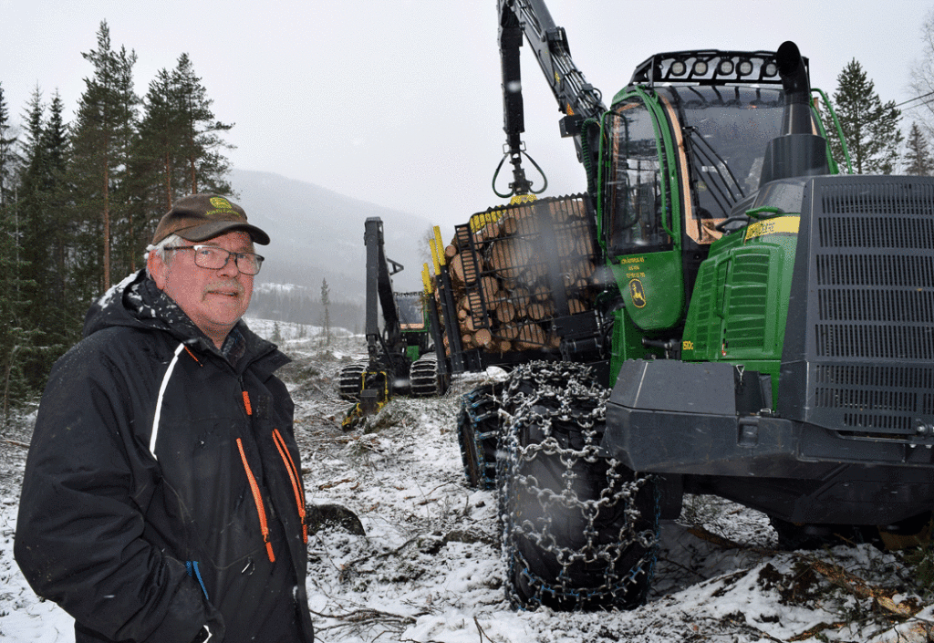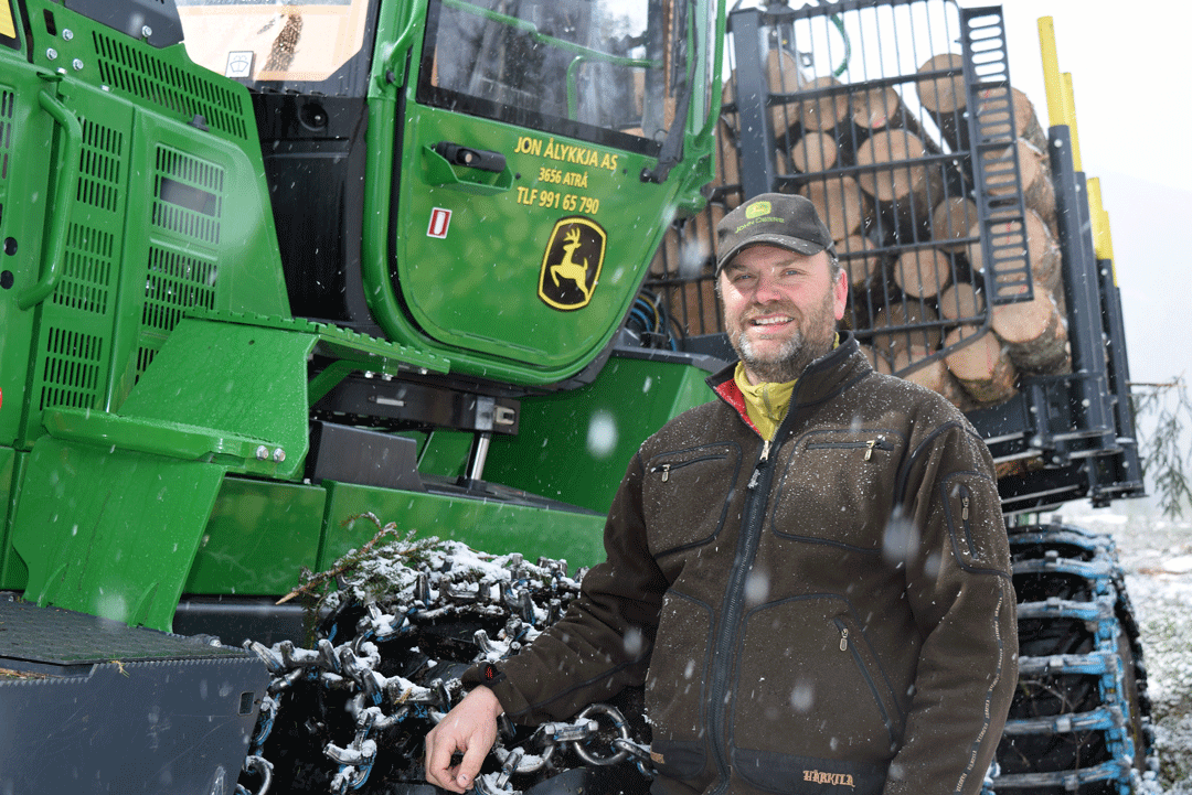 Det er den femte hogstmaskinen han har kjøpt i årene som selvstendig næringsdrivende. For bare et par dager siden kom den splitter nye lassbæreren fra John Deere, som Jan kjører.