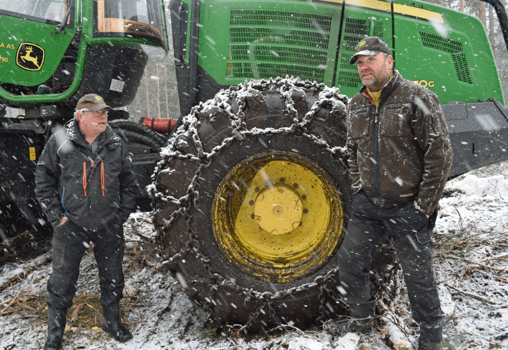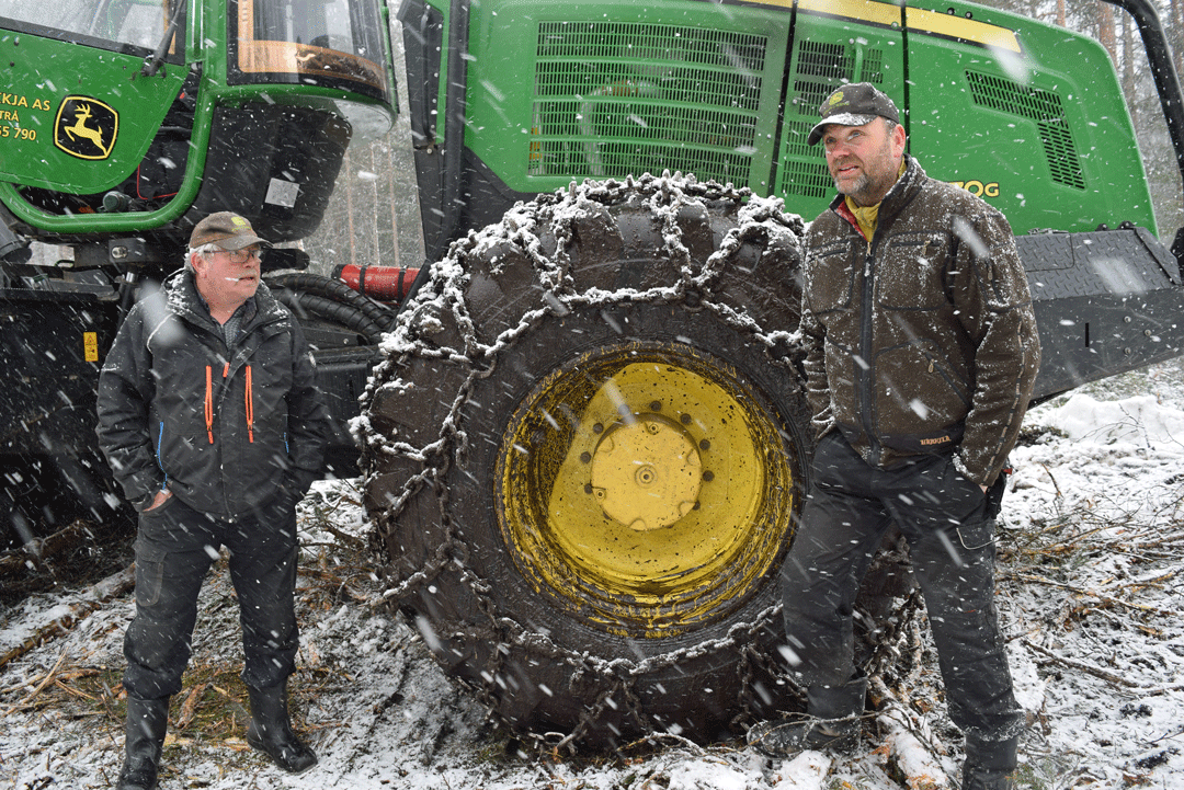 Jan og Jon er et godt team. Ofte er de på oppdrag langt oppe i ei bratt li. Utfordringene er store, men de erfarne skogmaskinførerne driver kontrollert og ryddig.