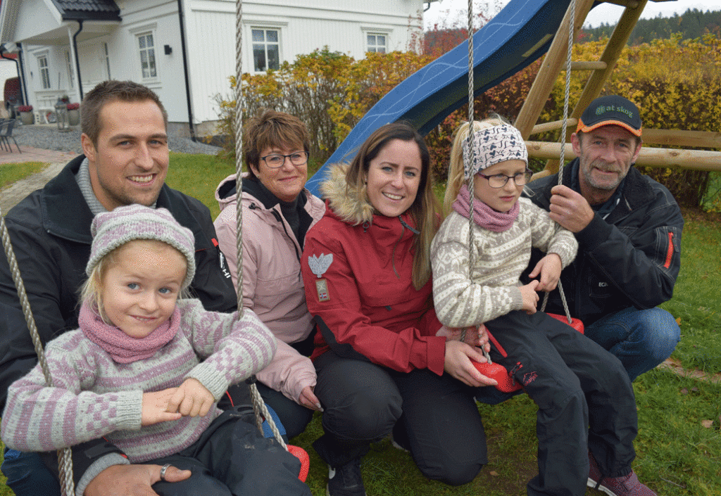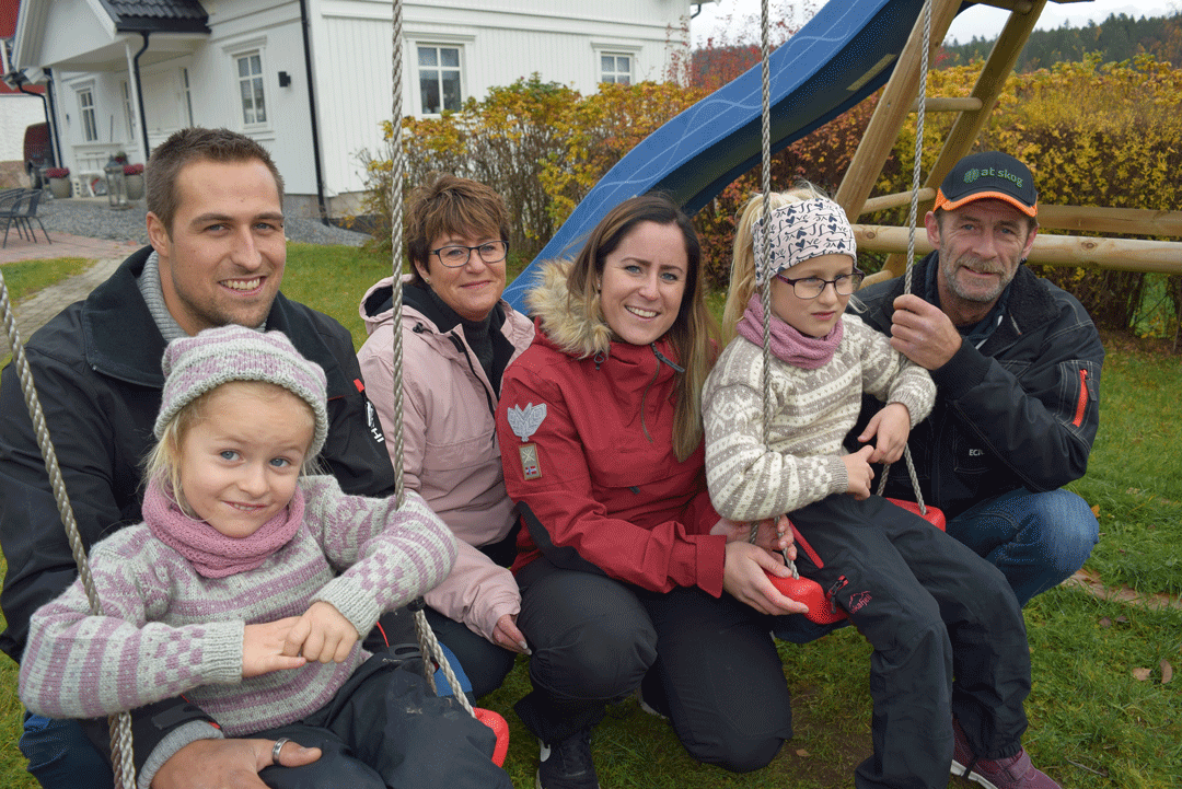 Rundt henne ligger tunet med hus, låve, garasje og nesten ferdig lekestue til døtrene, Madelen og Victoria. Familien på 4 flyttet inn i nytt hovedhus i januar.