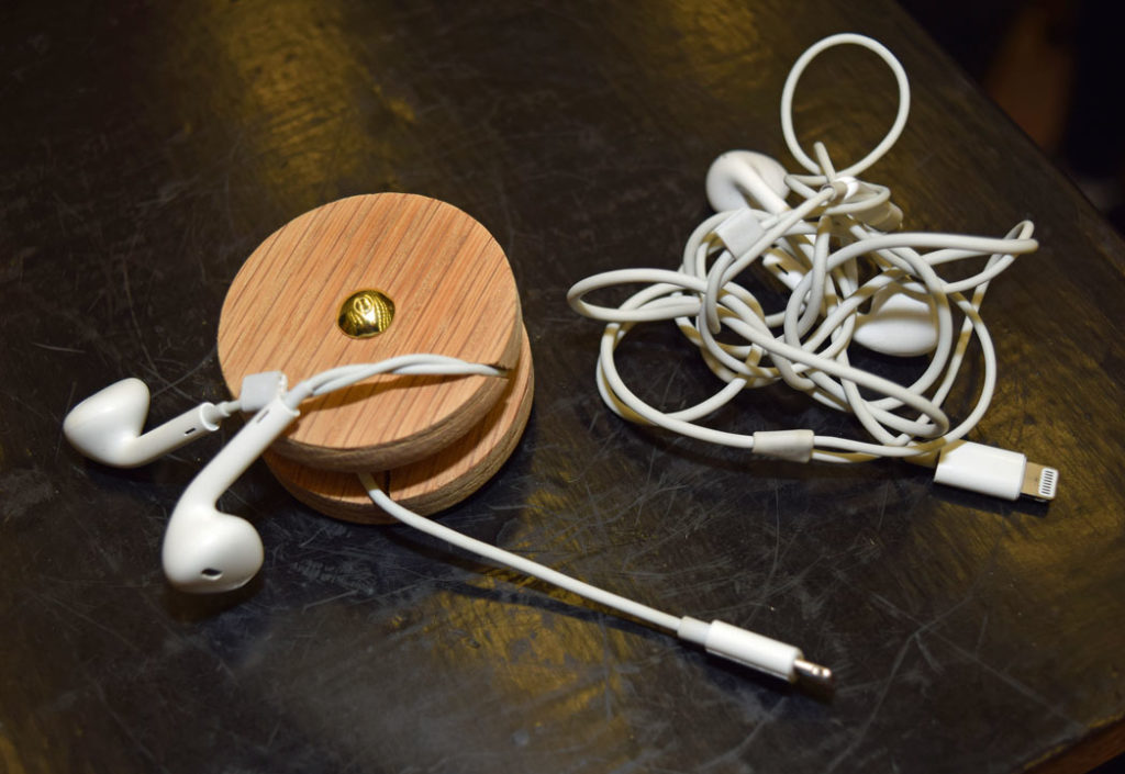 – Vi ville bruke tre, sier Emma Elise Aakre (til v), Helene Nærum og Tuva Borgersen. Med den kjekke lille saken PS Reel, kan du holde styr på øreproppene dine.