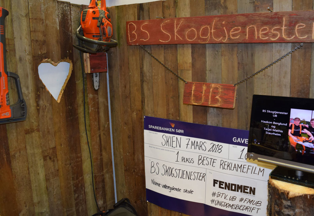 BS Skogtjenester fikk mye oppmerksomhet for standen de hadde montert i Skien fritidspark. Motorsag, øks, trevegger fra en gammel kornsilo med utedohjerte og stubber som interiør, vekket folks interesse.