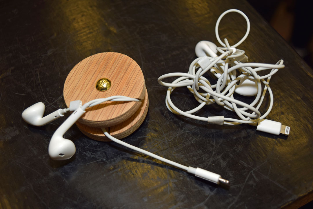 – Vi ville bruke tre, sier Emma Elise Aakre (til v), Helene Nærum og Tuva Borgersen. Med den kjekke lille saken PS Reel, kan du holde styr på øreproppene dine.