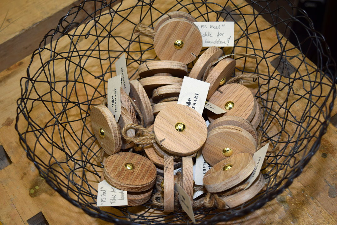 – Vi hadde noe eik liggende på låven hjemme, forklarer Tuva om prosessen fram til de begynte å produsere PS Reel. Jentene tenkte på flere ulike produkter i tre, før de landet på snella i eik.