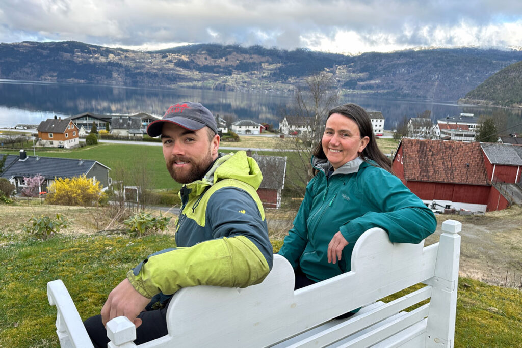 Håvard Næss Skåden og mor Gunn Bente Skåden med fin utsikt fra gården i Innvik i Stryn.