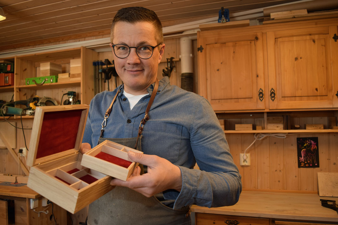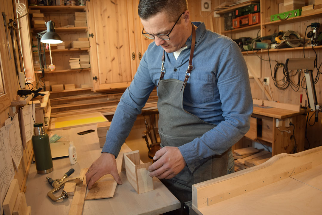 – Jeg begynte å lage treskrin for tre år siden. I høst bestemte jeg meg for å satse, og startet Waahlberg Skrinmaker. Verkstedet har jeg bygd opp over flere år, men har gjort noen investeringer i bedre utstyr.